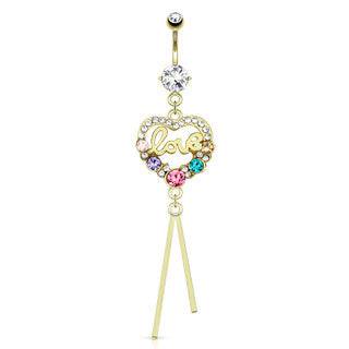14kt Gold Plated over Surgical Steel "Love" Multi Color Heart With CZ Gems Belly Button Navel Ring