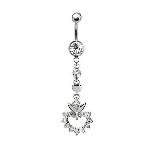 316L Surgical Steel CZ Gem Heart with Flower Top Dangle Belly Ring