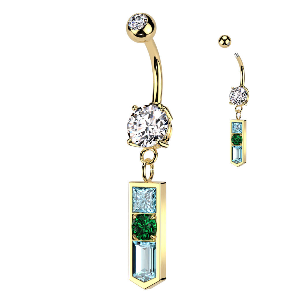 This 316L gold PVD surgical steel belly ring showcases a clawed white cz gem ball and a medieval-inspired pointed dangle adorned with aqua and green gems. creating a unique and elegant look.