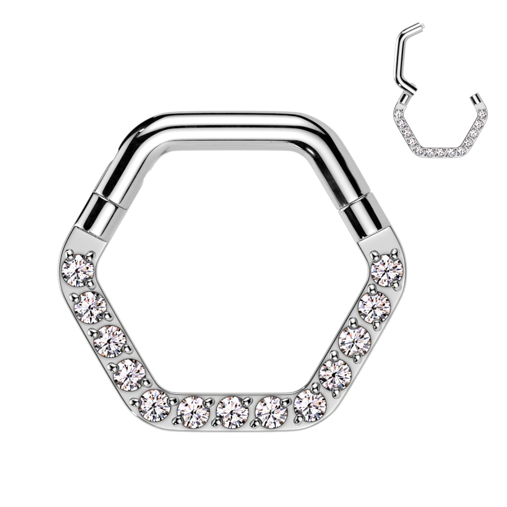 This hoop is made from 316L surgical steel. The hinged hoop is designed with hexagonal shape and white CZ gems. making it a unique choice for cartilage piercings. Its convenient clicker closure allows for effortless wearing and removal. This piercing is a perfect addition to your collection!
