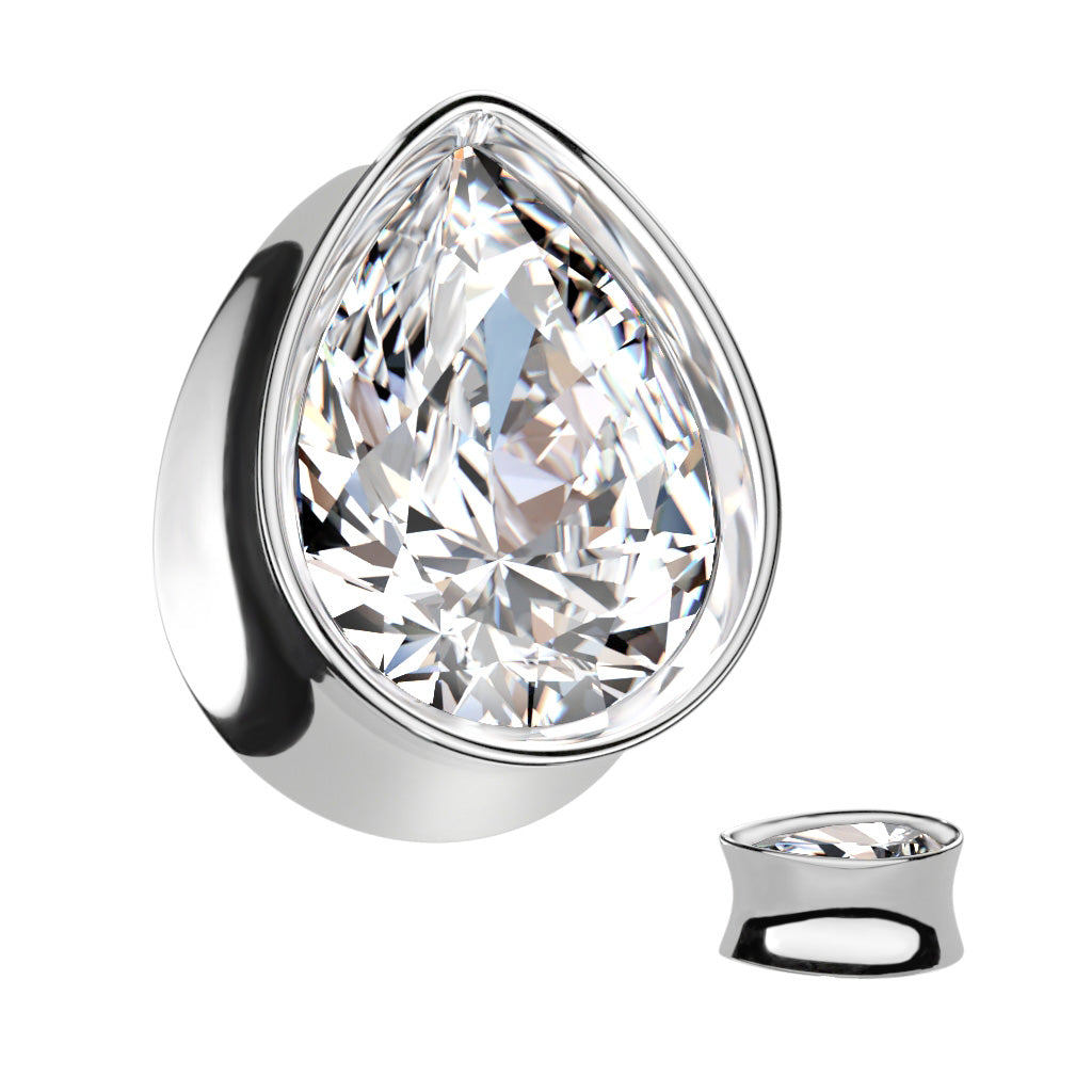 These 316L Surgical Steel White CZ Teardrop Plugs have white cubic zirconia gems. The plugs are double flared making them comfortable and secure.
