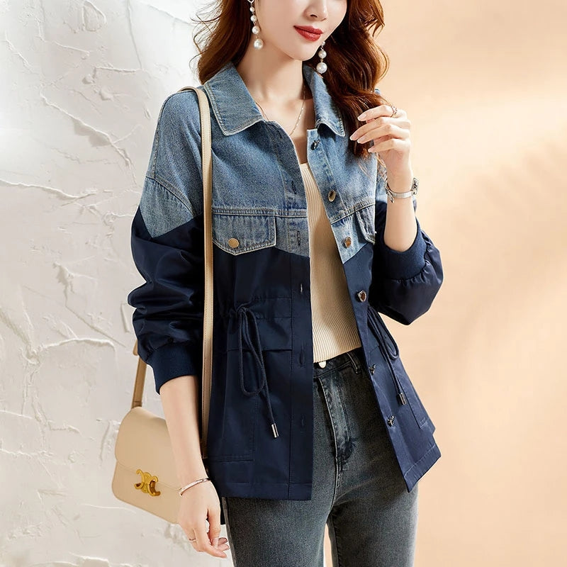 This color-block denim jacket combines vintage appeal with practical functionality through its adjustable drawstring waist and roomy utility pockets.