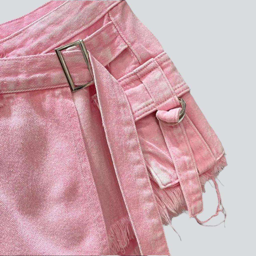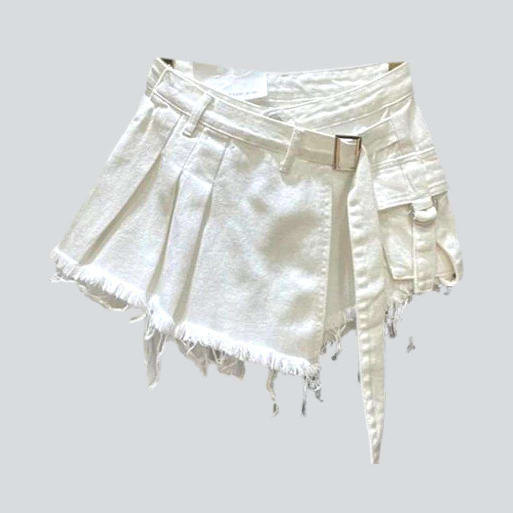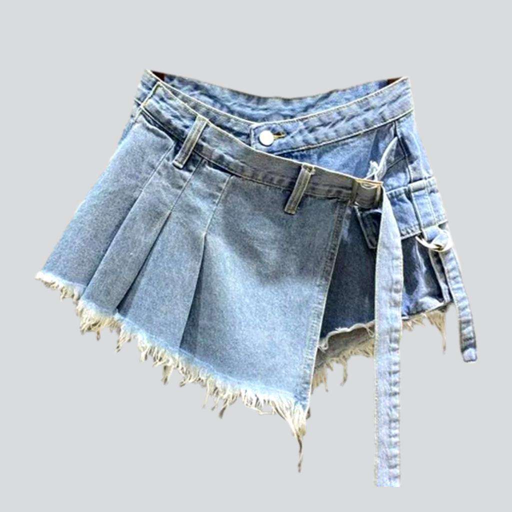 Look fashion-forward and keep up with the latest trends with our Asymmetric Pleated Mini Denim Skort from the 2023 Summer Collection! This mid-waist skort features an asymmetric cut. pleated detailing. zipper & button closure. and a vibrant color that's sure to turn heads wherever you go.