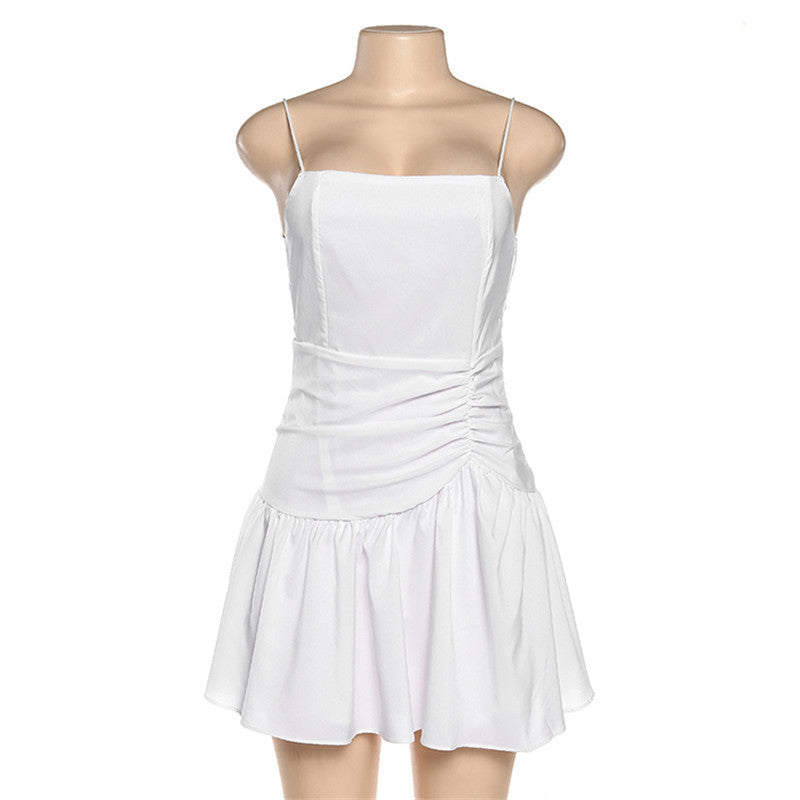 Flirty and feminine mini dress with a flattering slim fit and playful ruffle hem. Features a sleek one-shoulder neckline and a waist-accentuating frill design. This backless style offers a perfect blend of sophistication and allure.