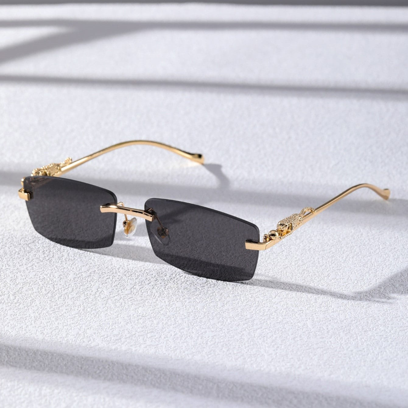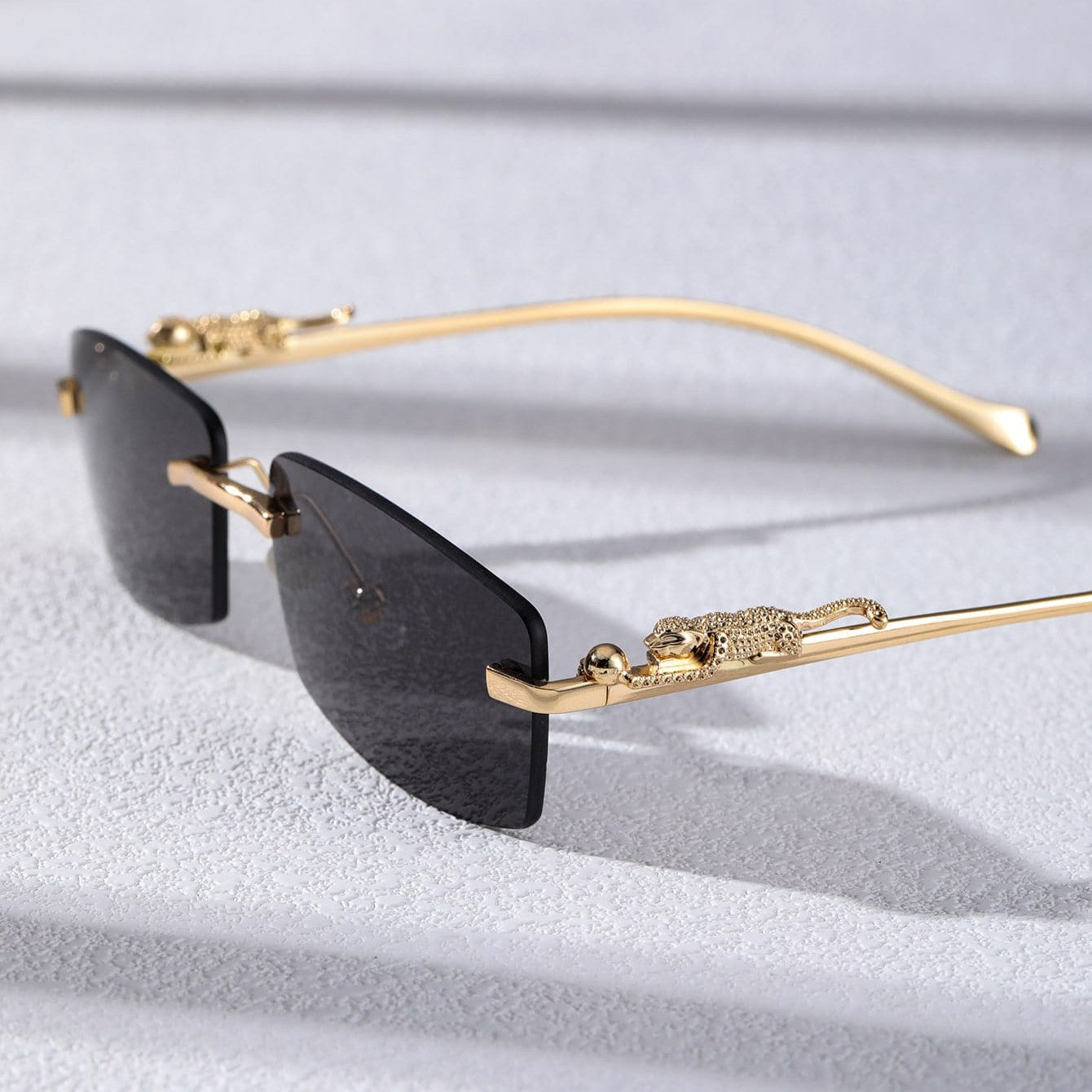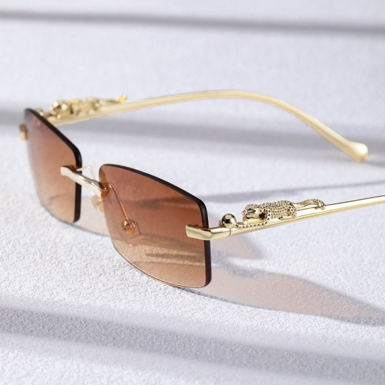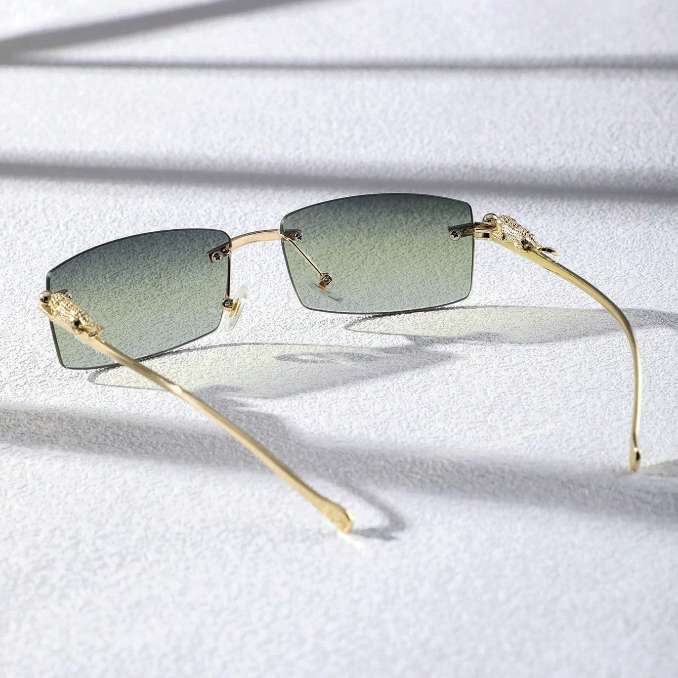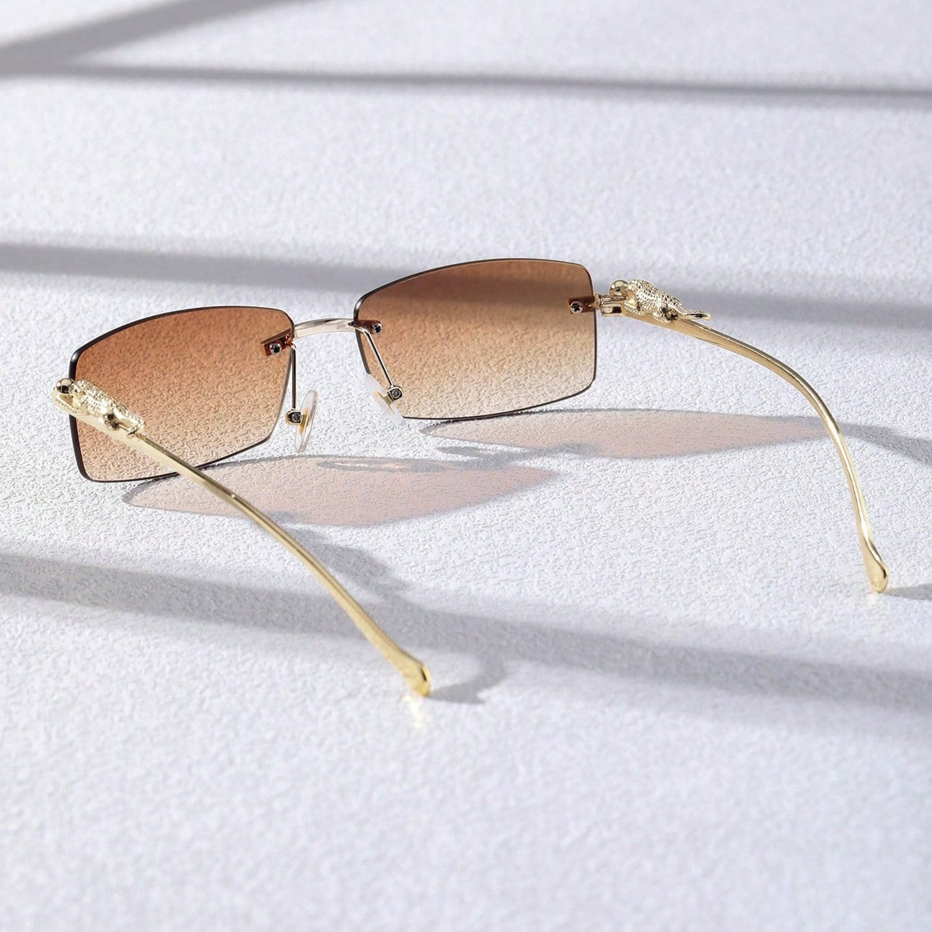 A narrow rectangular frame defines this pair of sunglasses in gold-toned metal. recalling popular styles from the '90s. A sculpted panther detail along the temples adds a bold. luxurious touch. completing the silhouette with a nod to untamed elegance.