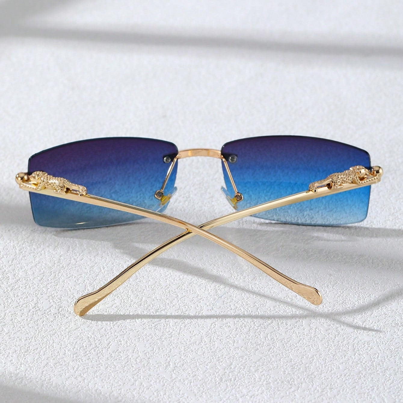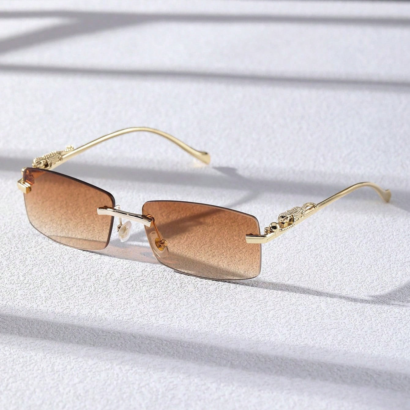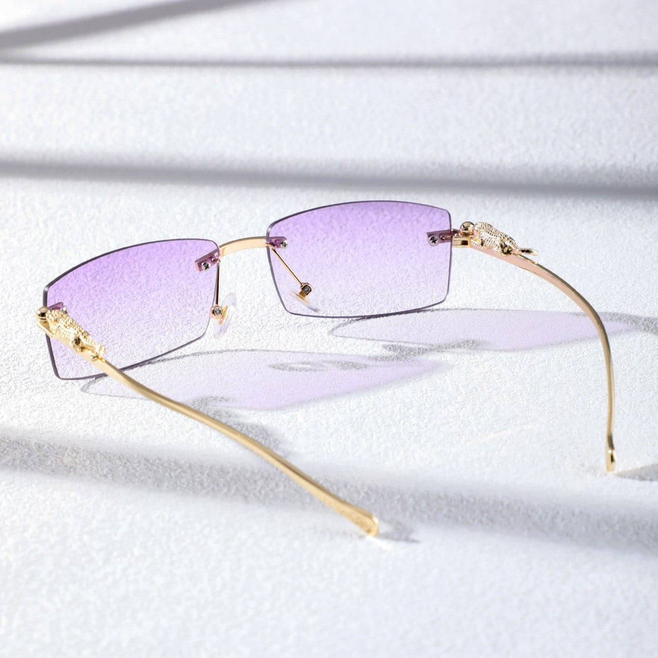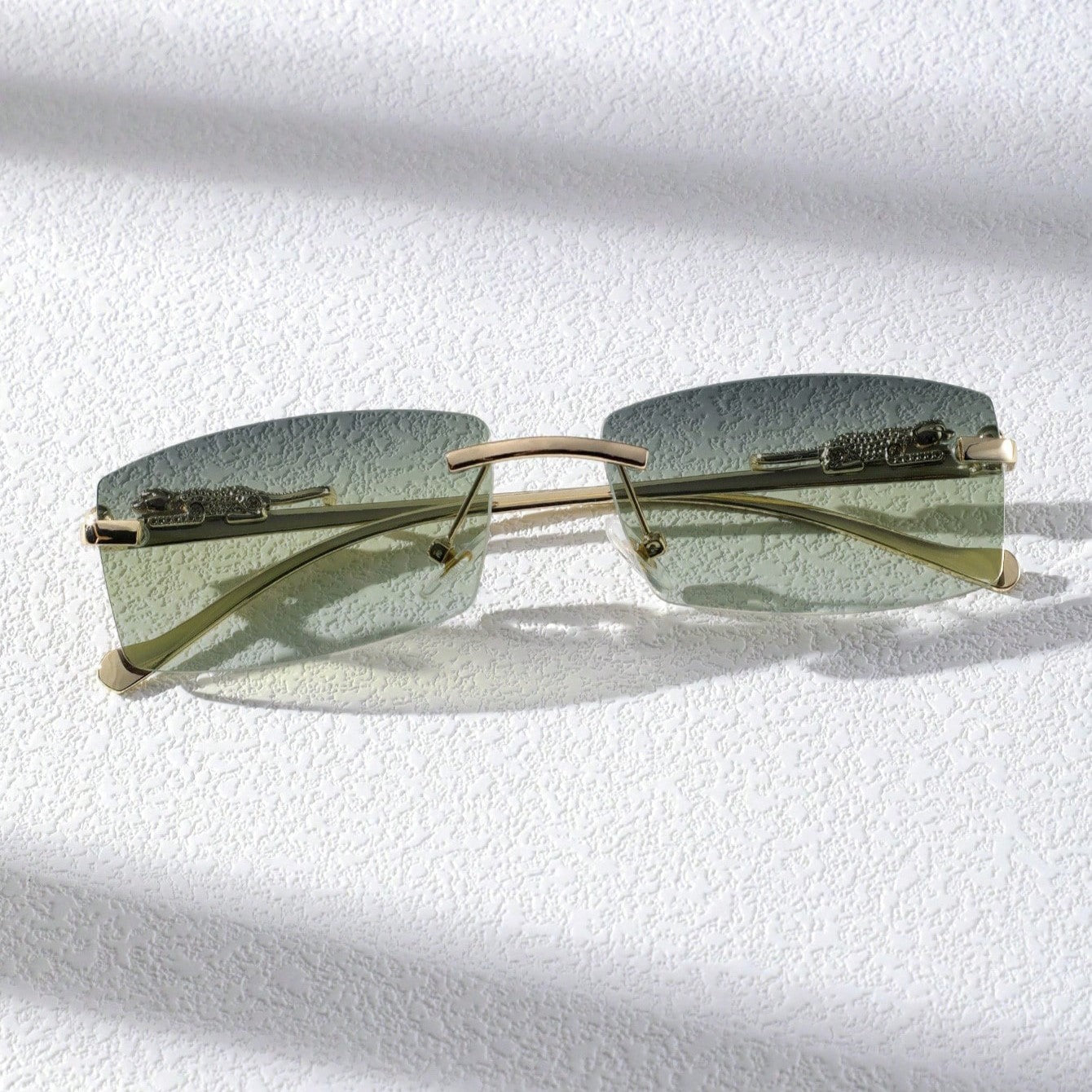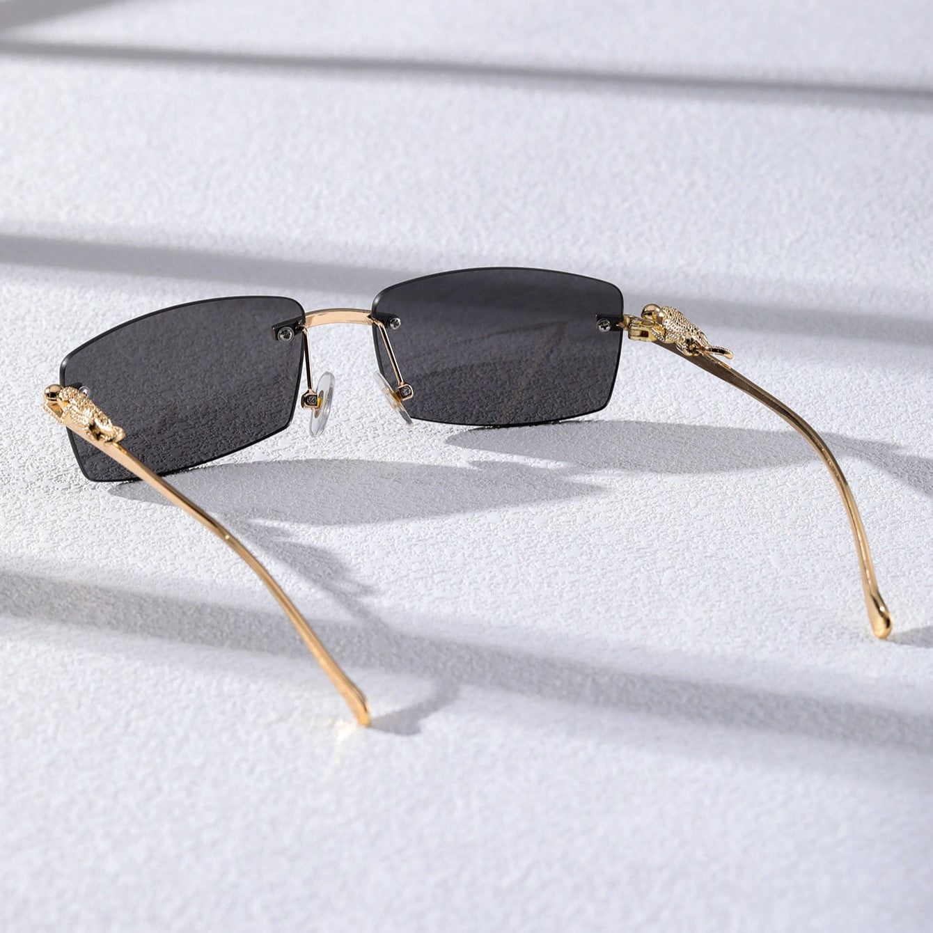 A narrow rectangular frame defines this pair of sunglasses in gold-toned metal. recalling popular styles from the '90s. A sculpted panther detail along the temples adds a bold. luxurious touch. completing the silhouette with a nod to untamed elegance.