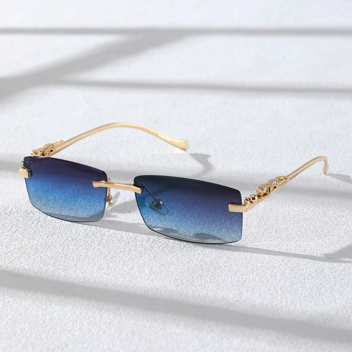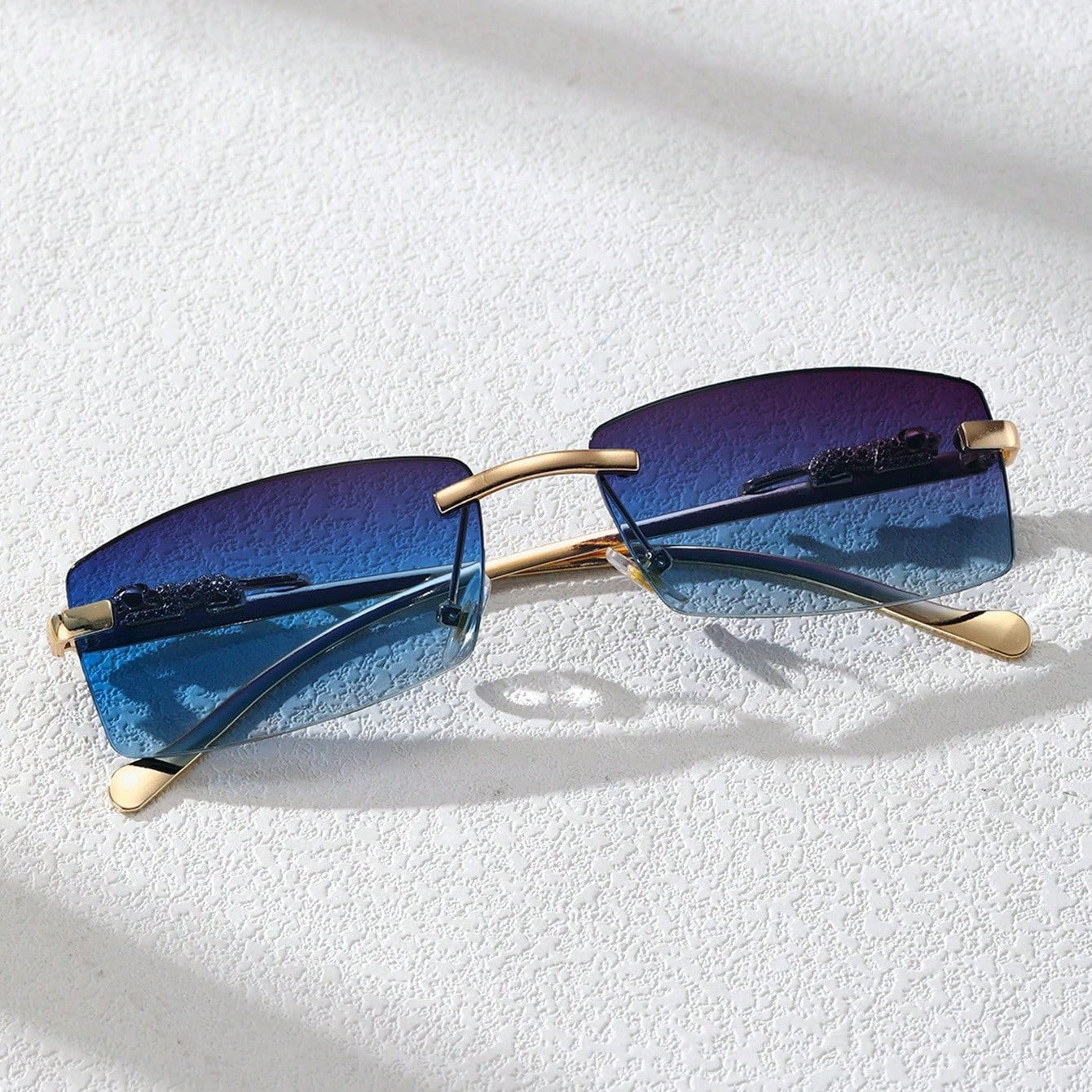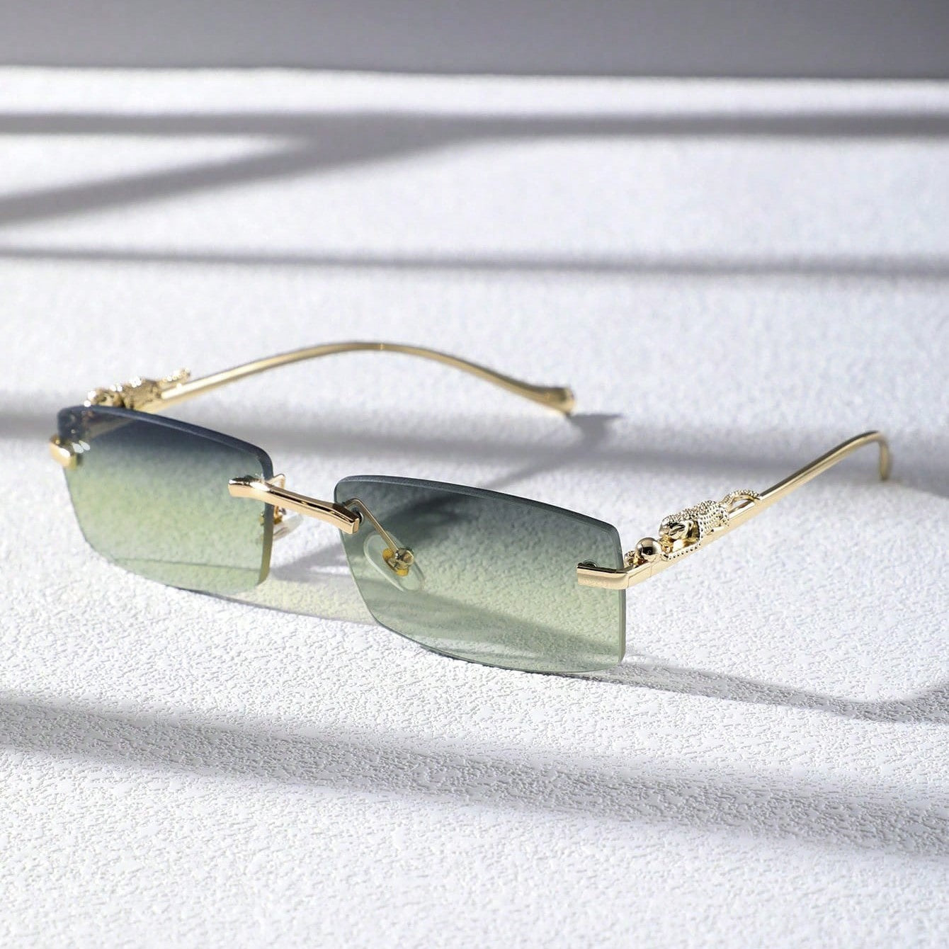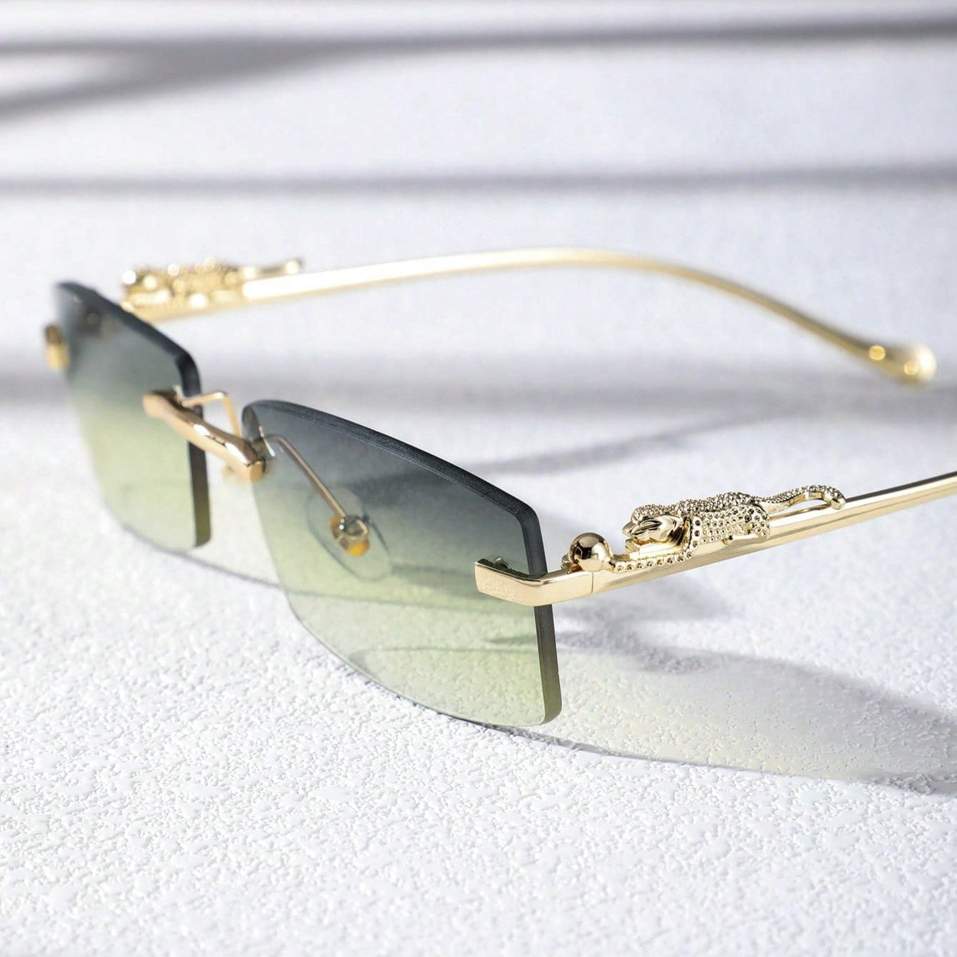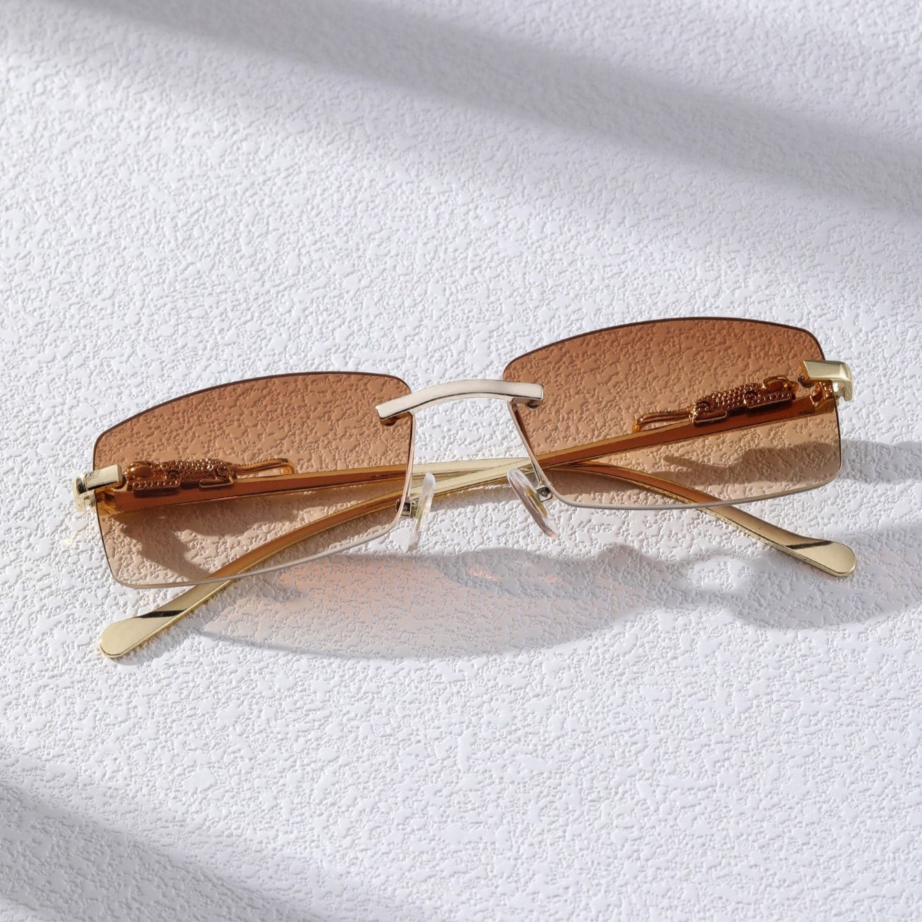 A narrow rectangular frame defines this pair of sunglasses in gold-toned metal. recalling popular styles from the '90s. A sculpted panther detail along the temples adds a bold. luxurious touch. completing the silhouette with a nod to untamed elegance.