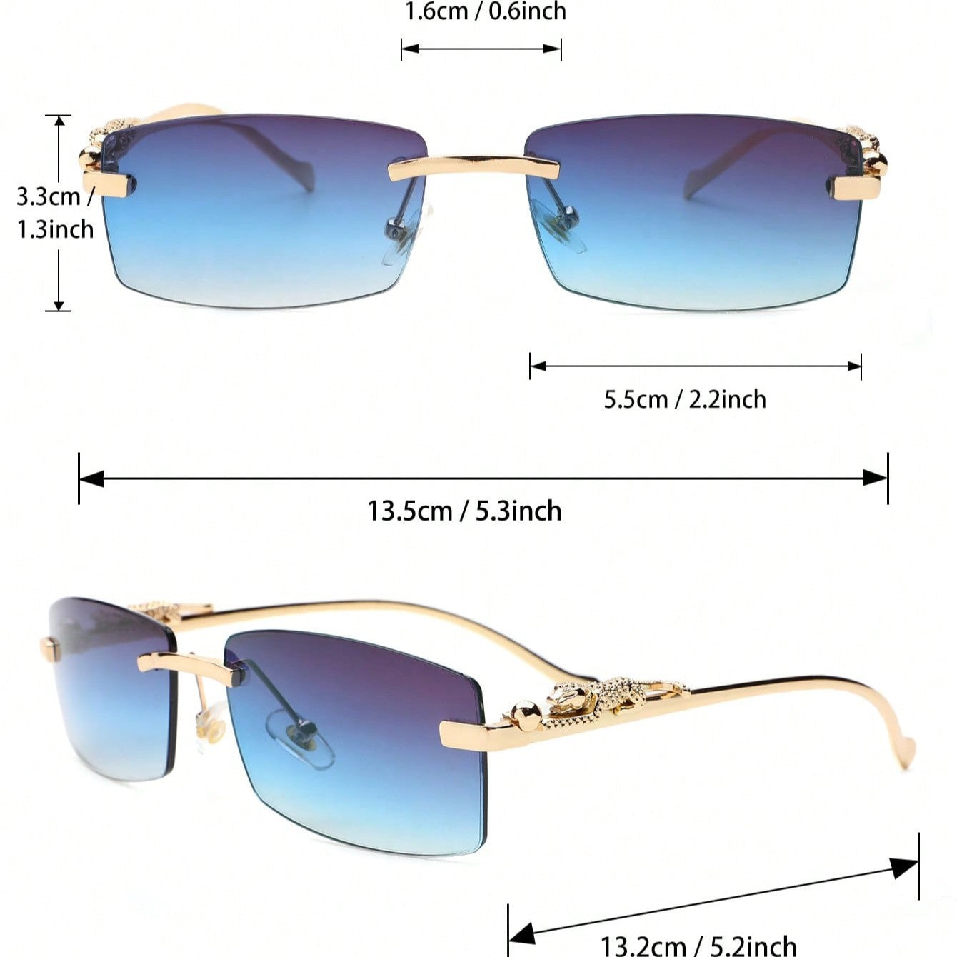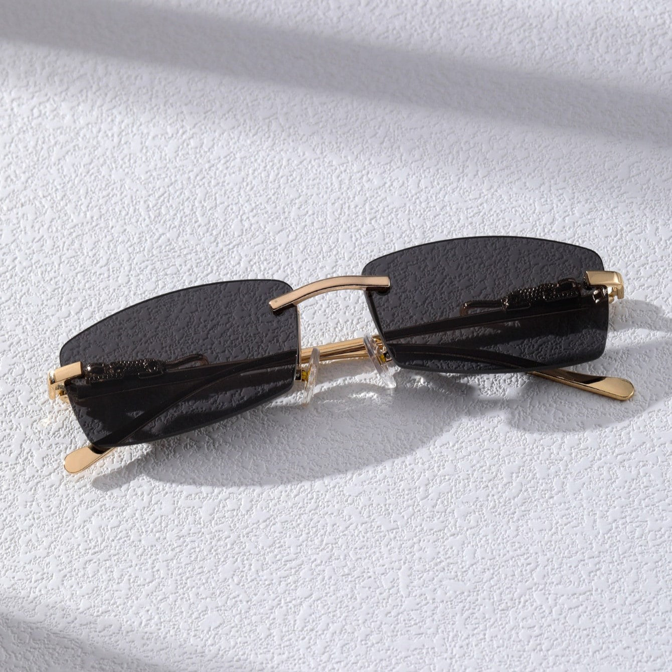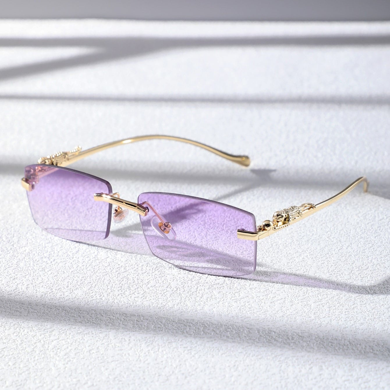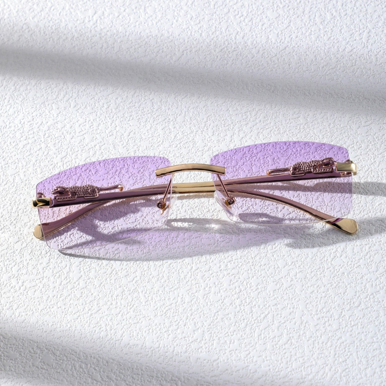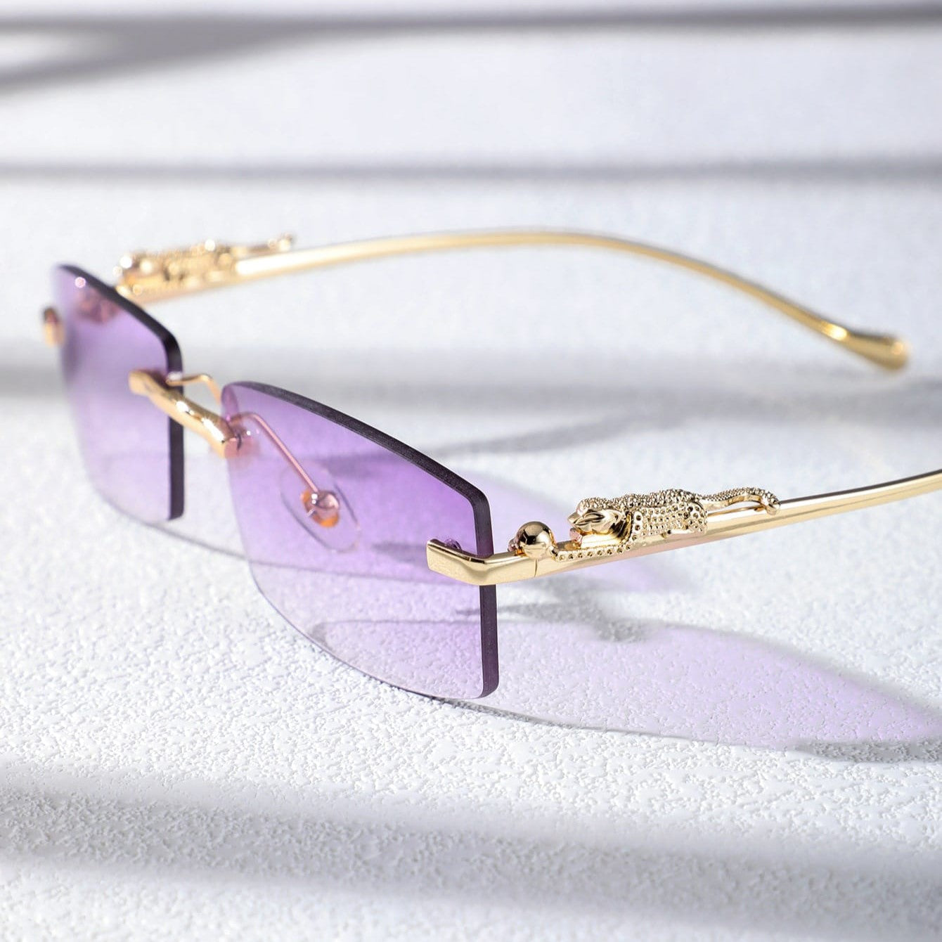 A narrow rectangular frame defines this pair of sunglasses in gold-toned metal. recalling popular styles from the '90s. A sculpted panther detail along the temples adds a bold. luxurious touch. completing the silhouette with a nod to untamed elegance.
