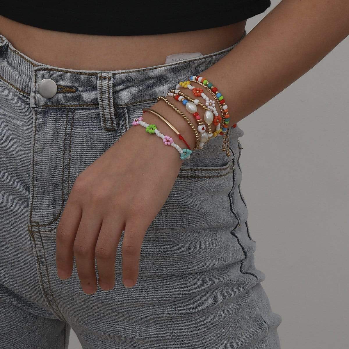 Bohemia 8 pieces Colorful Seed Beaded Pearl Chain Floral Bracelet Set