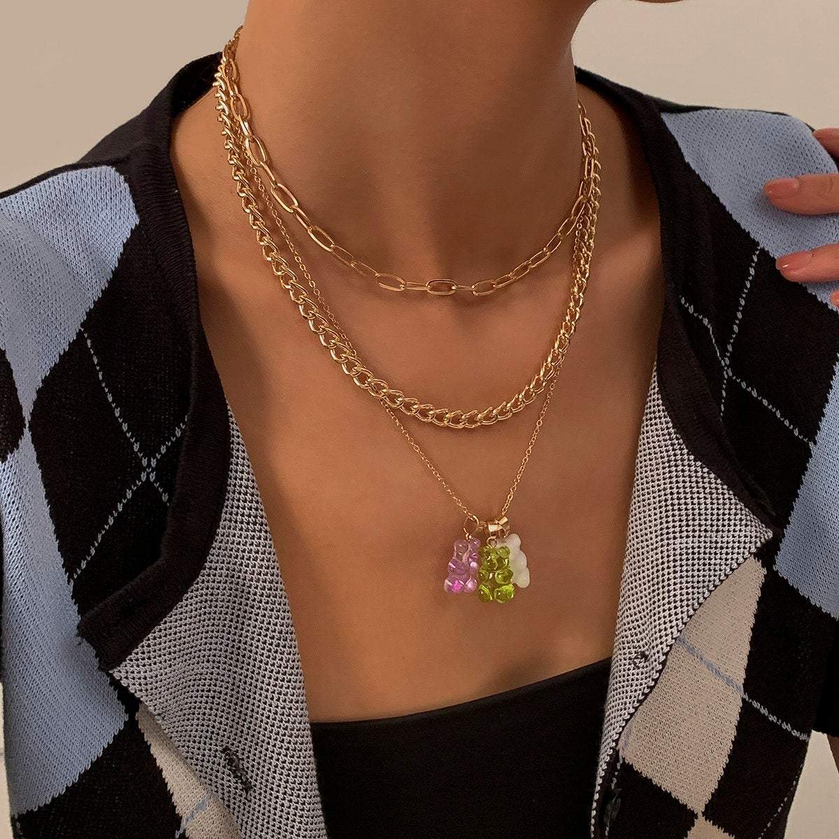 Bohemia Layered Colorful Bear Pendant Cable Curb Chain Choker Necklace Set