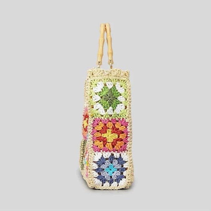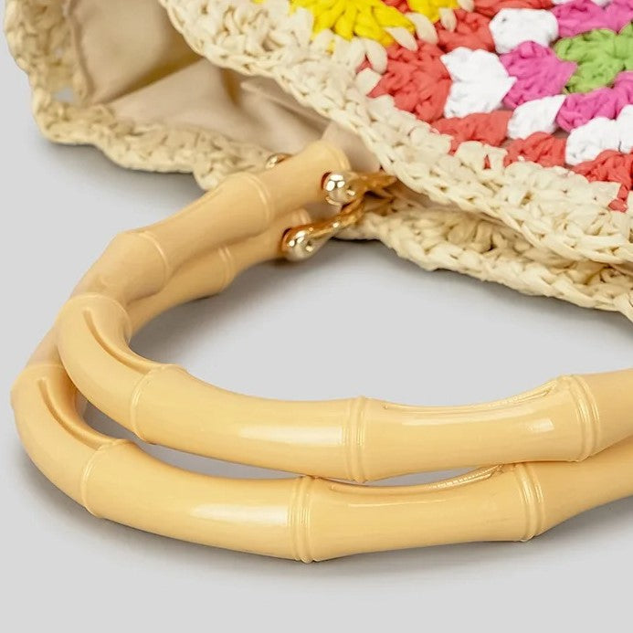 Vibrant and colorful. this hand-woven bag showcases unique crochet bohemian artwork paired with a bamboo handle. the ideal accessory for both urban adventures and beach days.