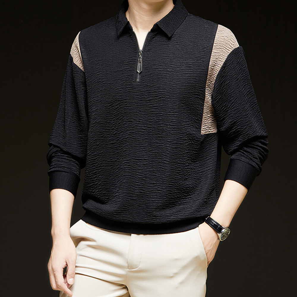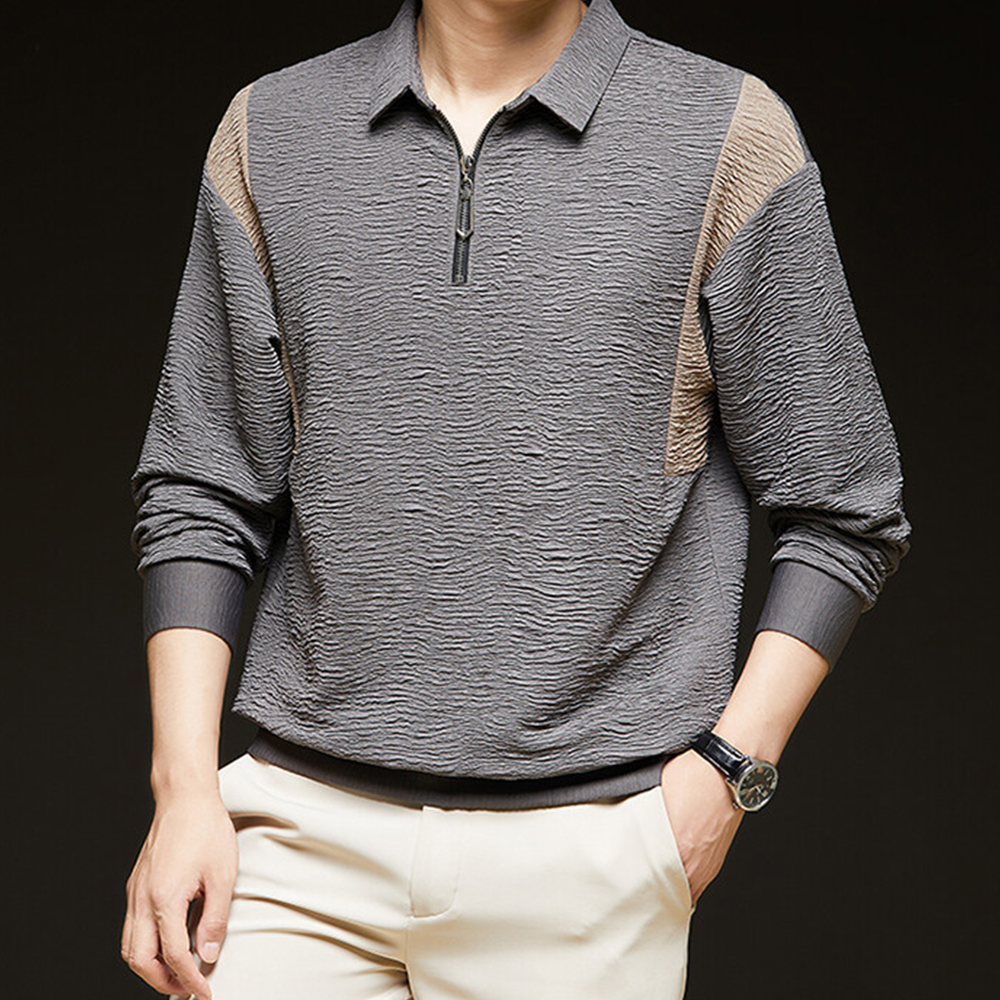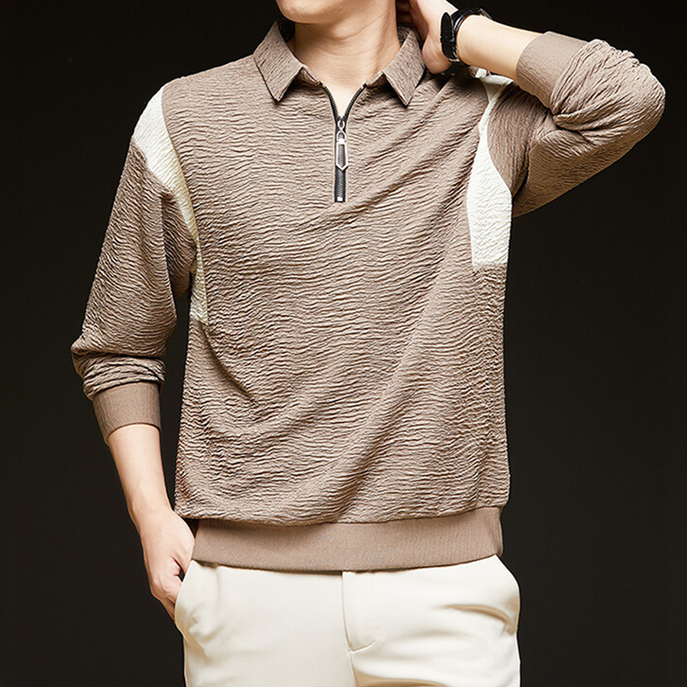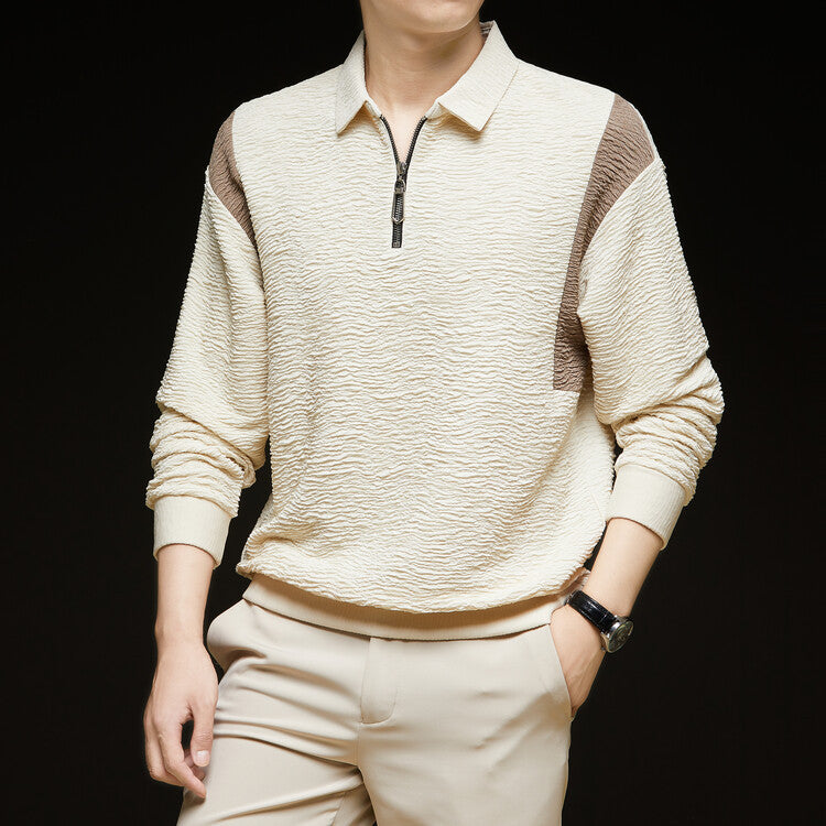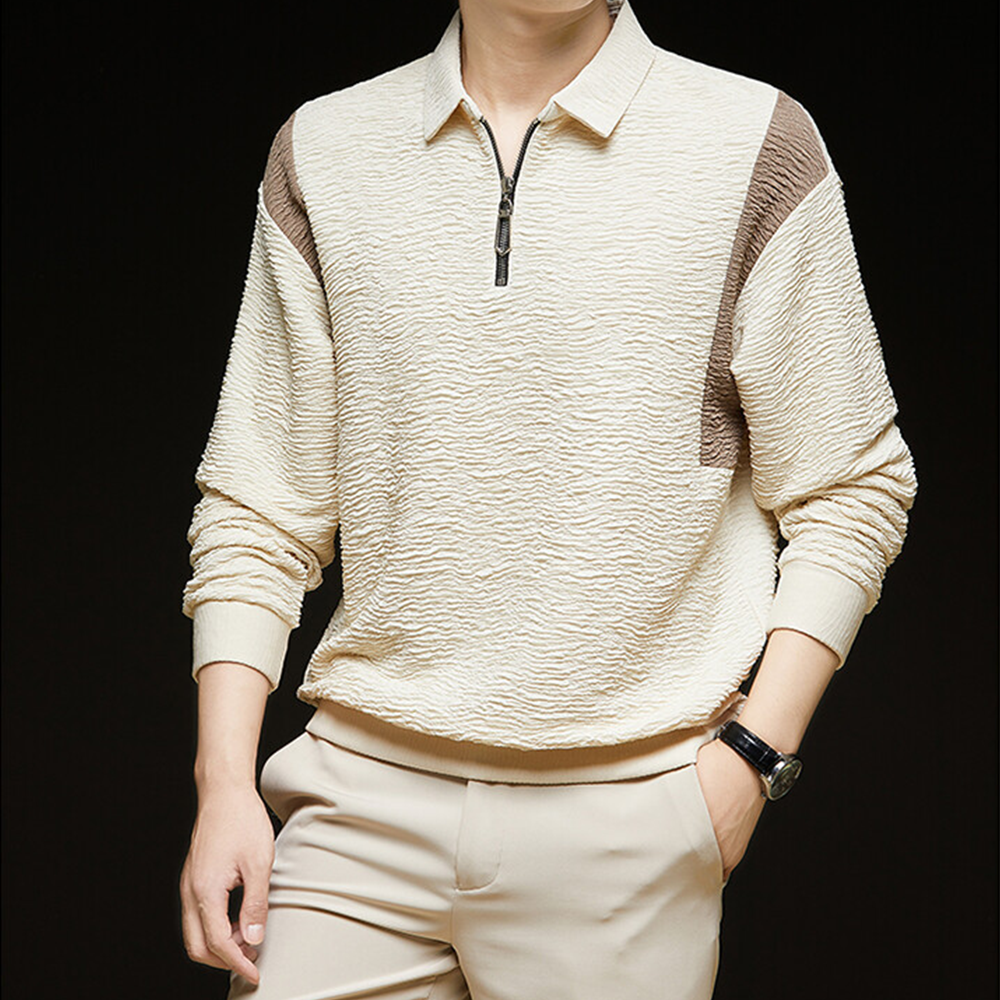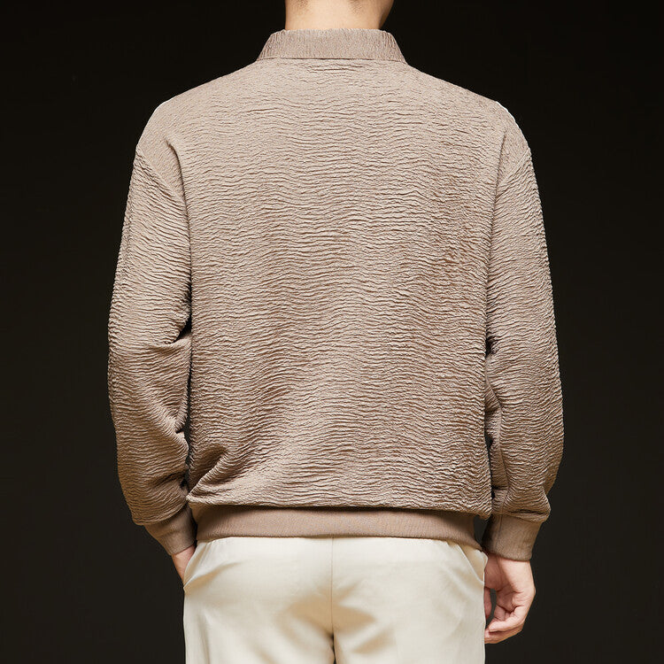 Achieve a laid-back look that won't go unnoticed with understated class in our crinkled long sleeve. Designed with a sleek half-zip closure and timeless polo-style collar. its relaxed fit ensures comfort. while the slightly loose silhouette and ribbed cuffs add structure and refinement.