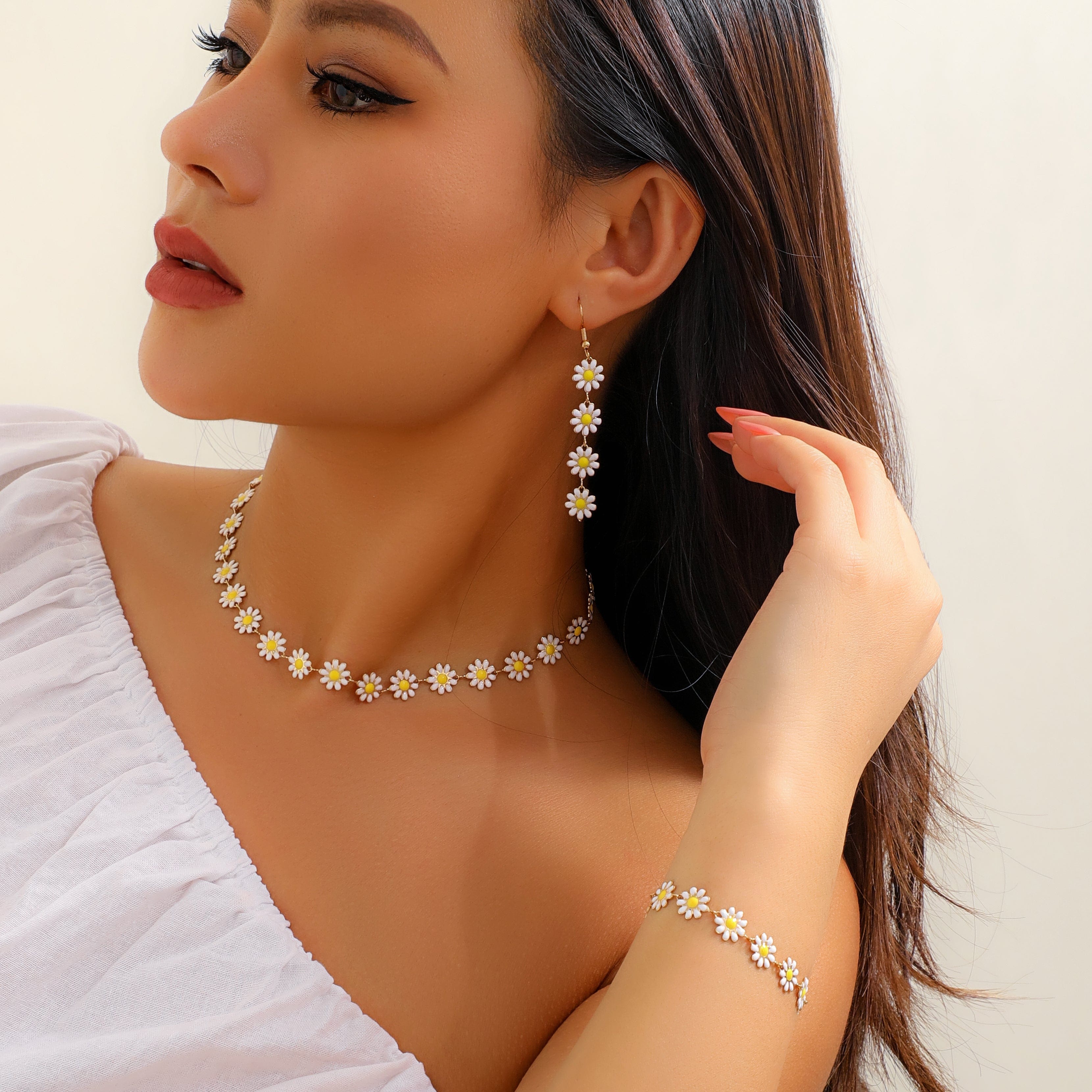 Chic Enamel Daisy Flower Necklace Earrings Bracelet Set