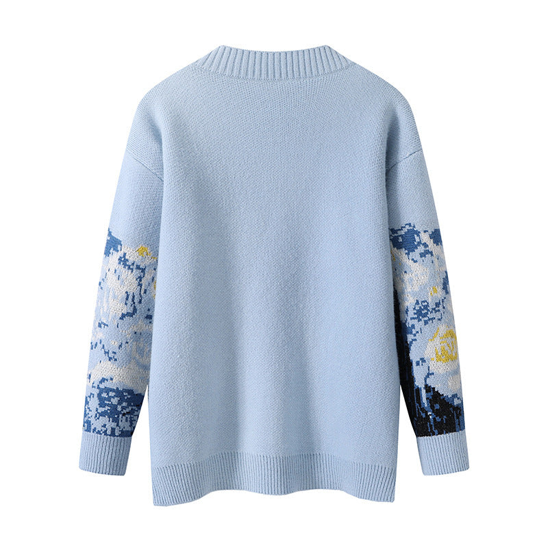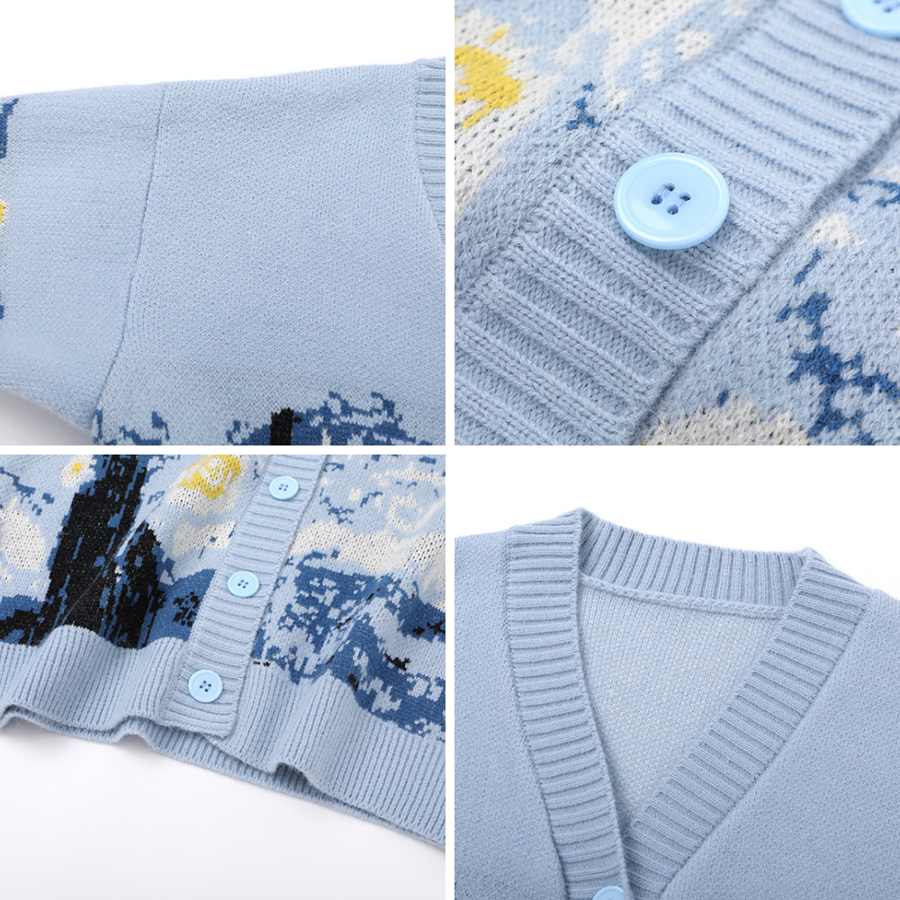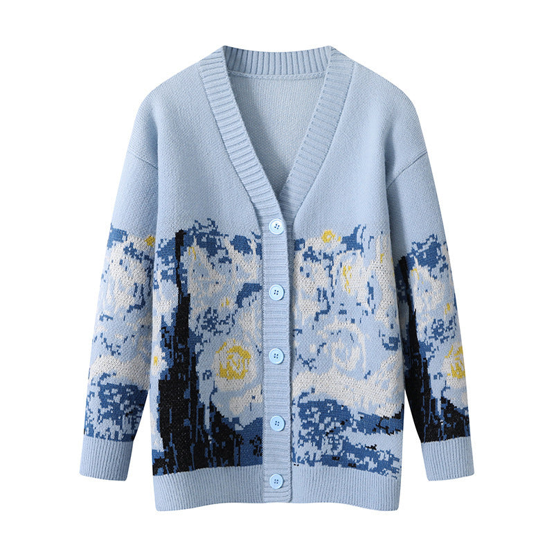 With a design that feels like a soft. painted sunrise. this cardigan brings an artistic touch to your look with gentle blues and swirling brushstrokes. while the ultra-soft knit keeps you snug and comfortable as the seasons shift.