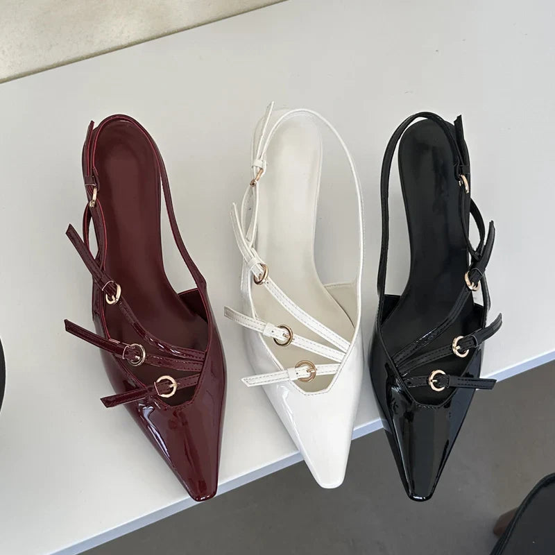Elegant yet effortless. these slingback heels offer all-day comfort with their cushioned insoles and supportive mid-height heel. The adjustable straps ensure a secure. personalized fit. while the glossy finish adds a touch of refined charm. Easy to maintain and versatile enough to transition from work to evening events. these heels are designed to keep you stylish and comfortable. no matter where your day takes you.