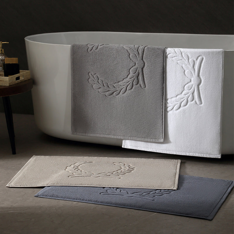 Indulge in the ultimate bathing experience with our Embossed Laurel Bath Mats. transforming your bathroom into a serene oasis. Crafted from 100% cotton. these mats offer unparalleled softness underfoot while elevating your bathroom's aesthetic.