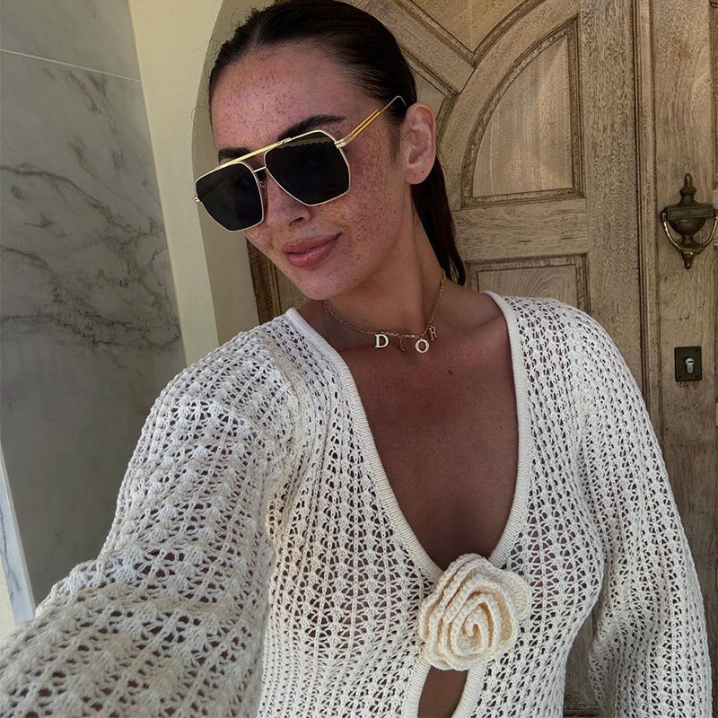 The standout feature of this dress is the stunning corsage detail at the shoulder. which adds a touch of romance and femininity to the overall look. The plunging V-neckline and backless design create a sensual and alluring silhouette. while the long sleeves offer coverage and versatility for various settings.