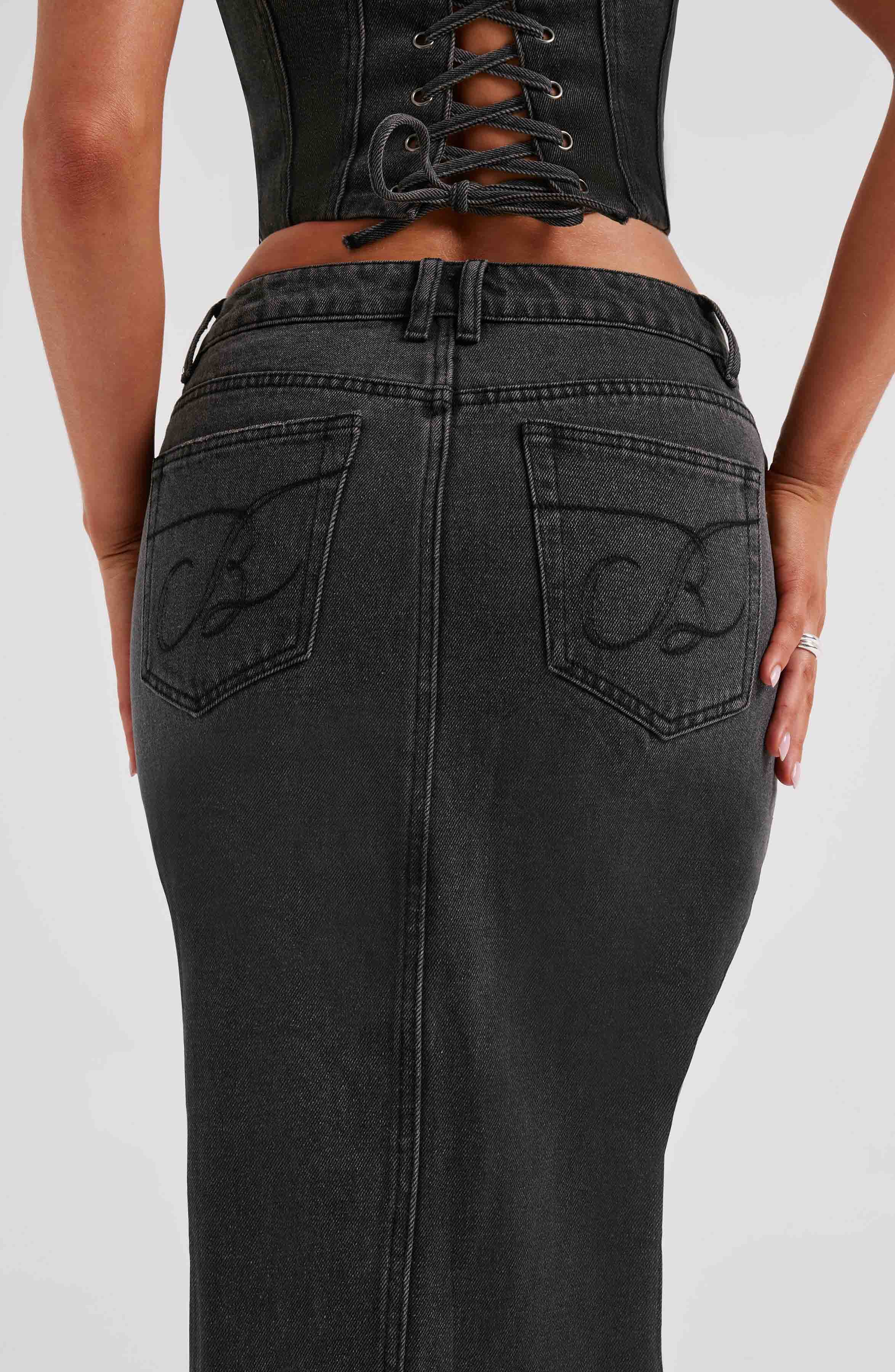 Do double denim to perfection with the Flor maxi skirt and Yasie corset. Our new denim maxi skirt features a high waist fit. middle split and button and zip fastening.