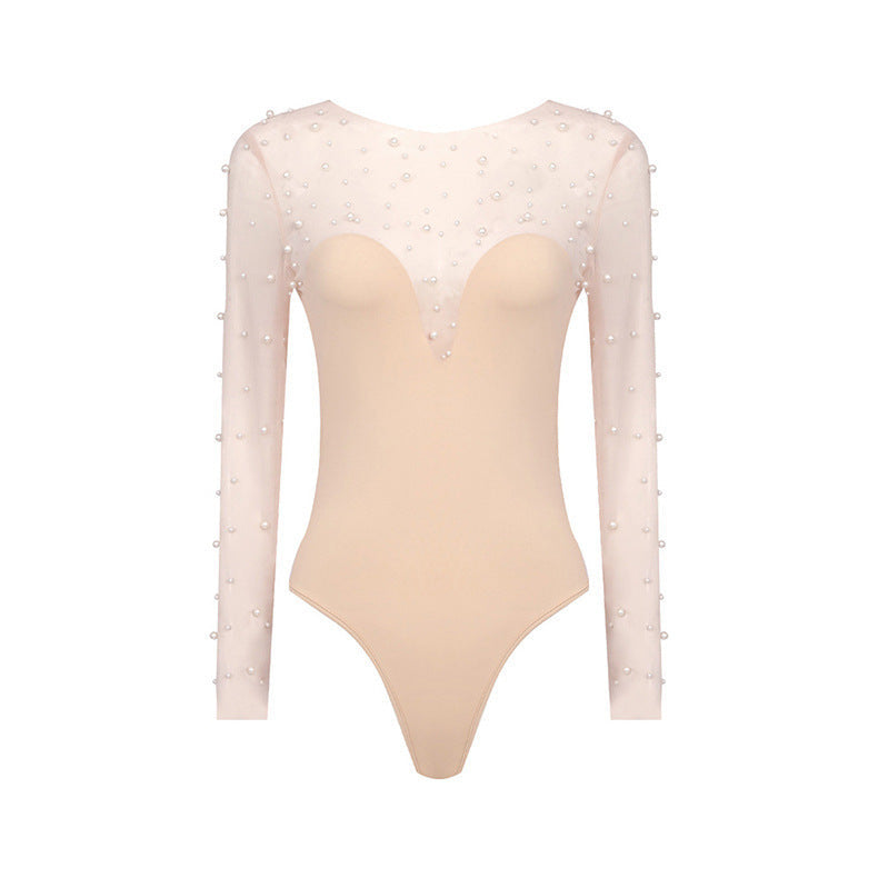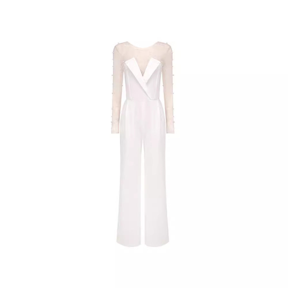 Make an elegant statement in the showstopping Celeste pearl jumpsuit. This head-turning one-piece features a sleek bandeau neckline adorned with shimmering pearl embellishments over alluring sheer mesh fabric.