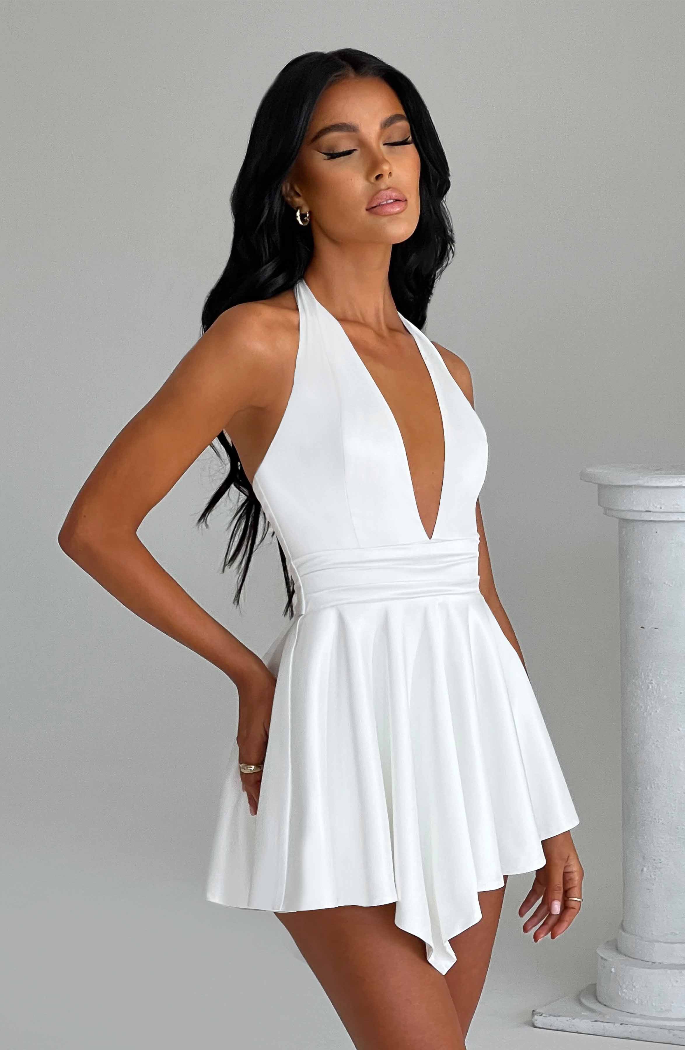 Gaia is ultra feminine. flirty and the perfect piece for cocktails with the girls. date nights and vacays. With a super plunge neckline and halter straps. this design ties around the body to the back to cinch your waist. We especially love the flowy. draped shorts with dipped hem for pretty movement and highlighting great legs.