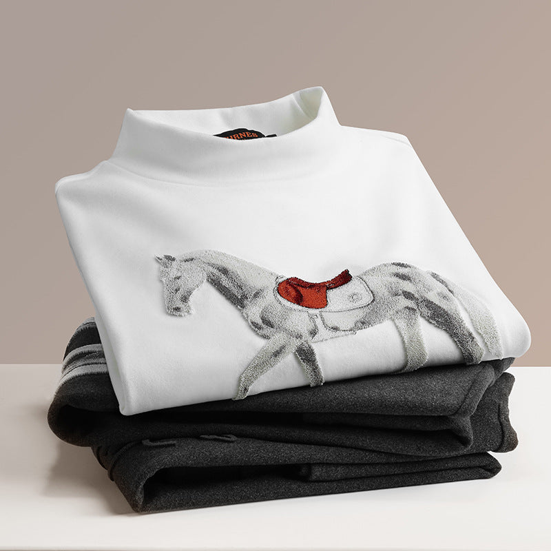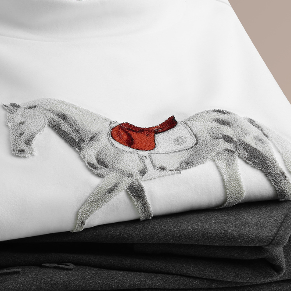 The centerpiece is a beautifully embroidered horse. brought to life with specialized 3D stitching that creates depth and texture. making every detail—from the saddle to the mane—stand out.