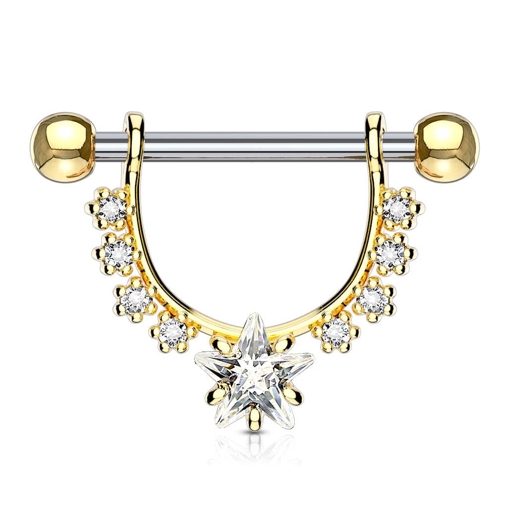 Gold Plated Surgical Steel Star Dangle White CZ Nipple Ring Barbell