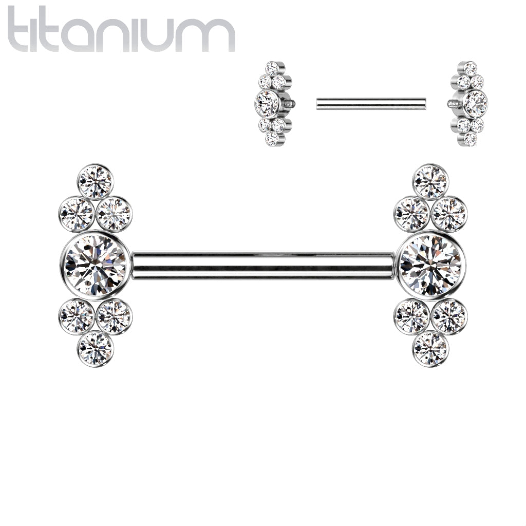 This dainty white cz bezel gem cluster nipple bar is implant grade titanium. The ends are internally threaded and can be removed from both sides. These bars are available in 14ga with a bar length of 14mm.