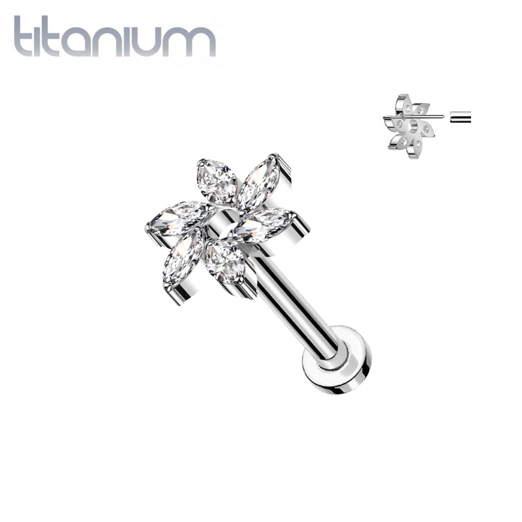 This Threadless Implant Grade Titanium Labret is perfect for any piercing. It has a marquise flower cz threadless top and it comes in 3 different gauges with 3 different lengths. These are easy to put in and secure so it doesn't fall out.