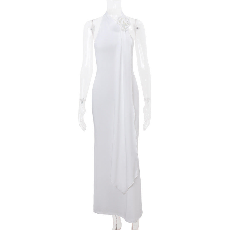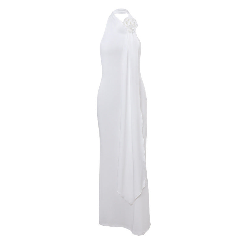 Radiate timeless glamour in the Sabrina 3D floral applique open-back halter gown. available in sizes S-L. This white knit dress strikes the perfect balance of sultry and sophisticated.