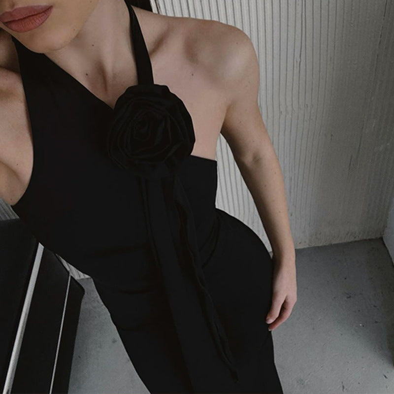 The sleeveless halter neckline sculpts your curves before leading into a plunging V-shaped back framed by thick halter straps. Along the bodice. lush floral appliques bloom across the front and wrap around to the sides. adding dimensional texture.