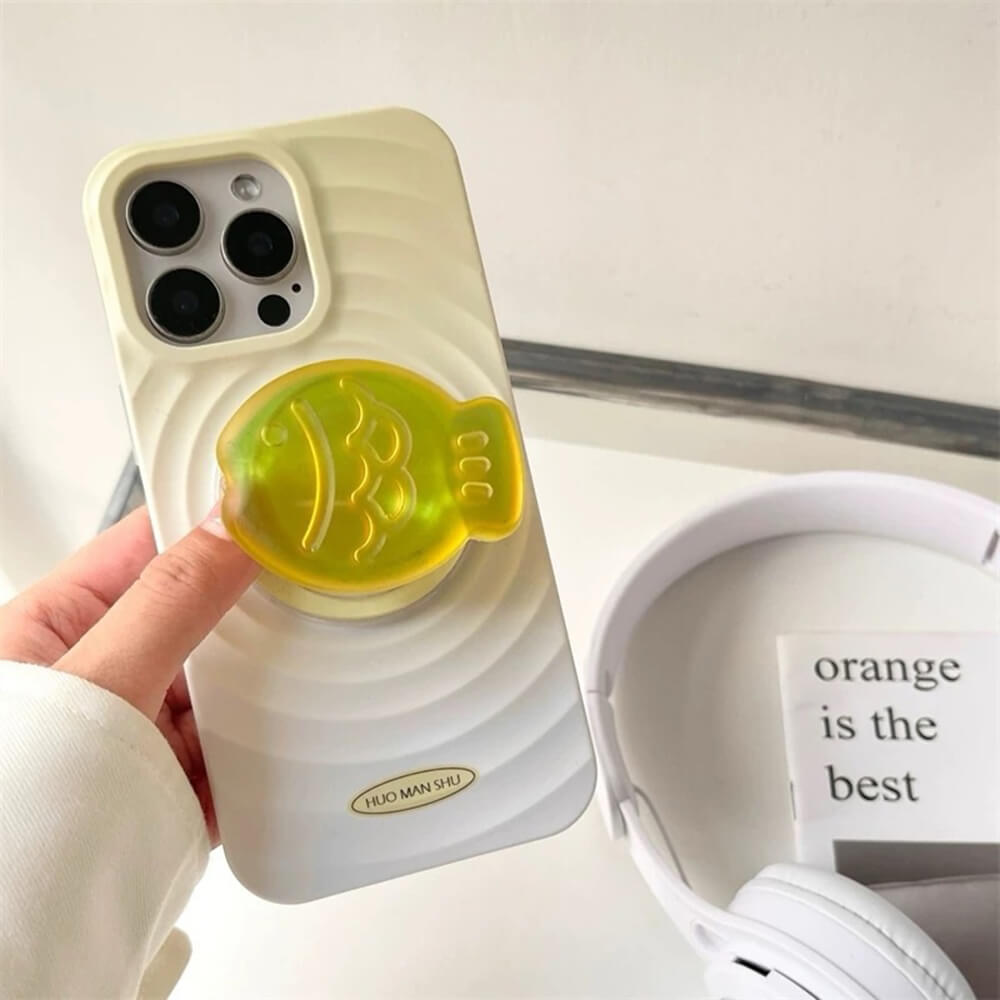 This aesthetic iPhone case features a soft matte finish with ripple texture and a gradient fish-shaped stand for a unique aquatic-inspired look