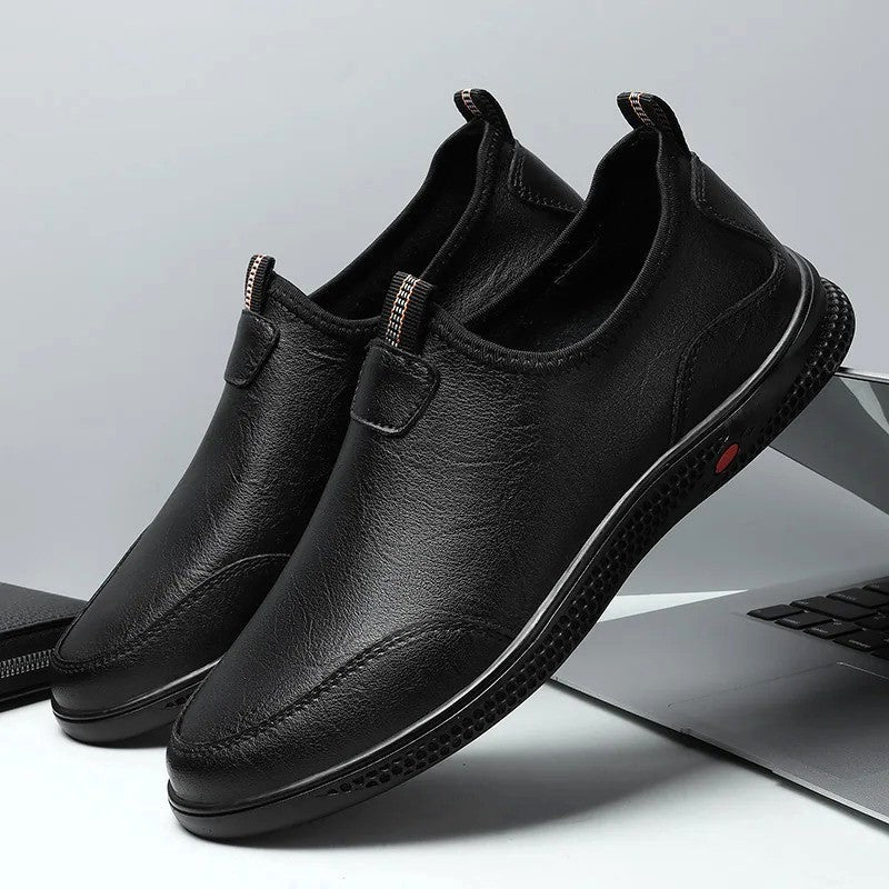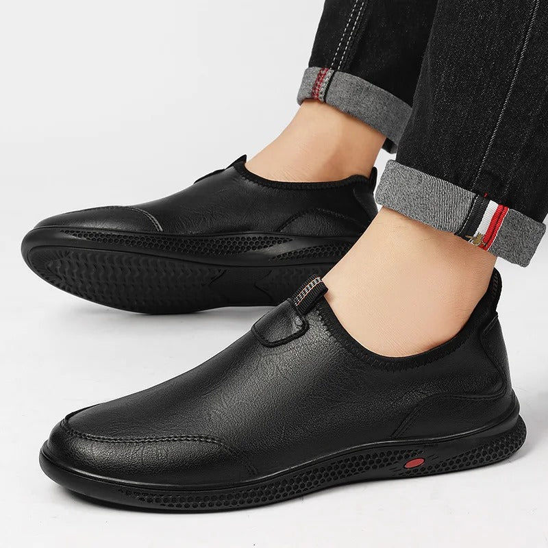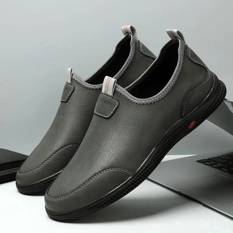 Genuine leather and a natural rubber outsole bring a refined look to these stylish slip-on shoes. furnished with an arch-supporting. cushioned footbed for superior comfort.