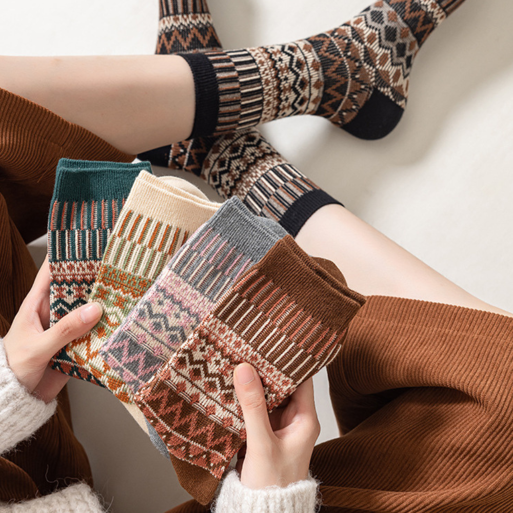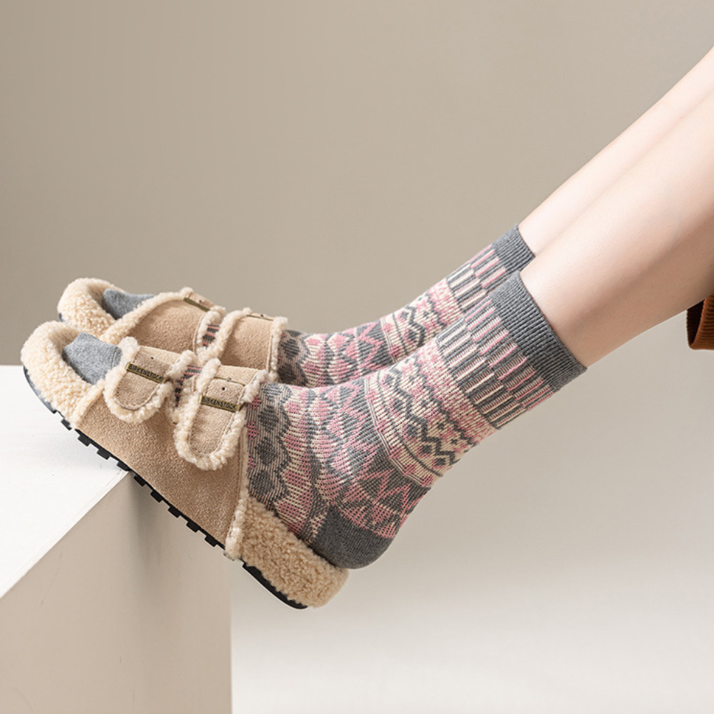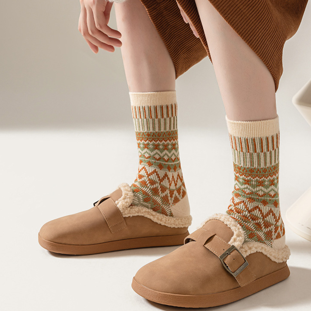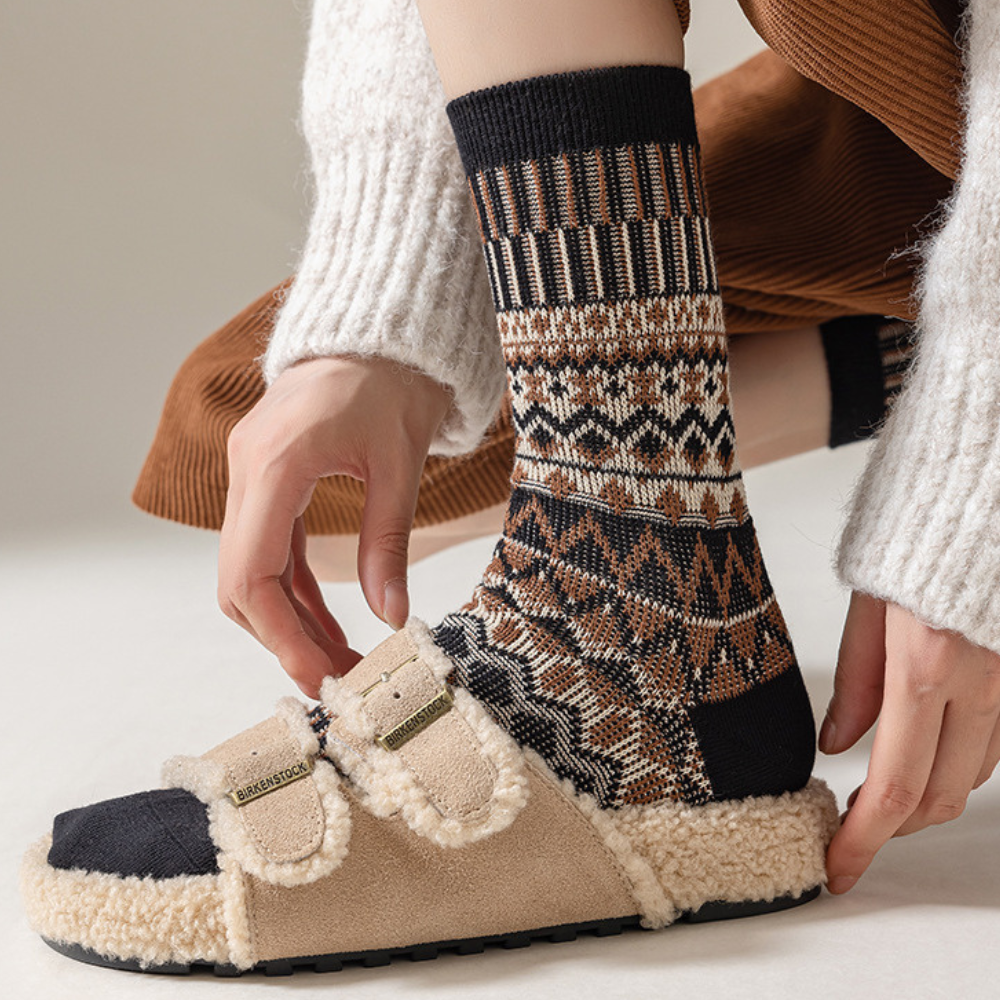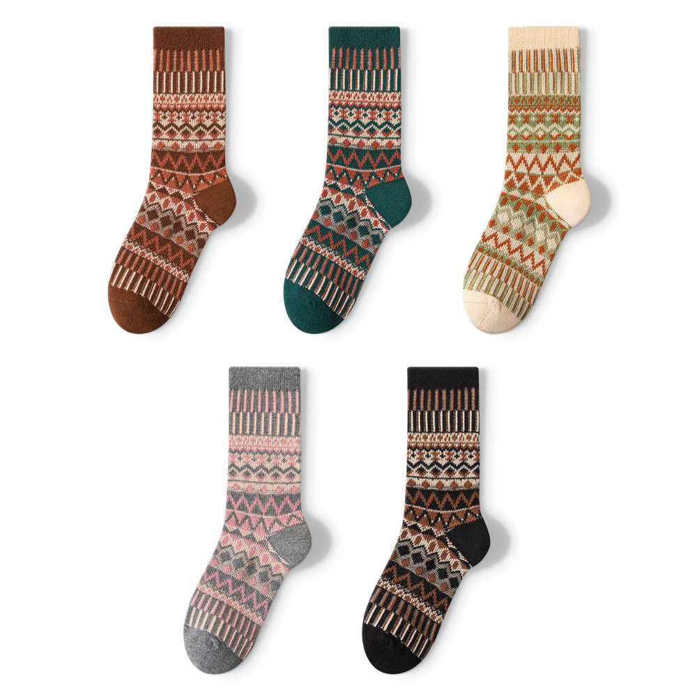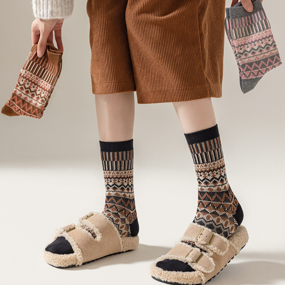 Keep your feet warm and happy with our cozy cotton socks. inspired by classic Nordic patterns. They're soft. breathable. and sturdy enough to handle every wash without losing shape.
