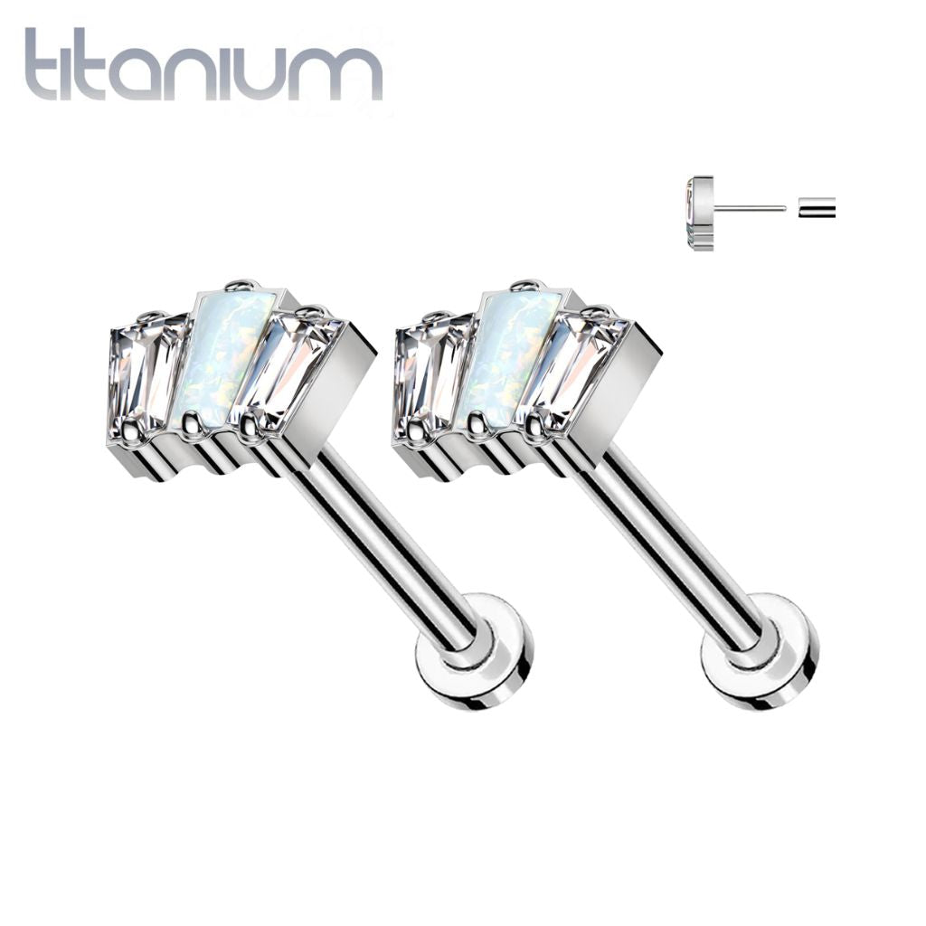 Pair of Implant Grade Titanium Triple Baguette White Opal CZ Threadless Push In Earrings With Flat Back
