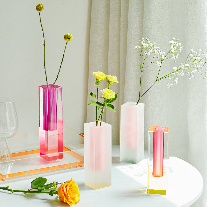 Add a splash of joy to your space with these handcrafted. limited-edition acrylic vases. Their vibrant colors and sleek. modern design instantly brighten up any room. from your cozy living space to your work desk. Whether you're showcasing fresh flowers or letting them stand alone. these playful pieces bring just the right amount of color to transform your space and make you smile every day.