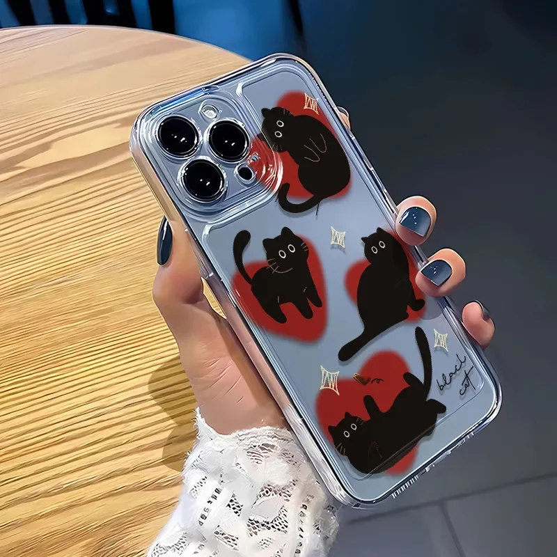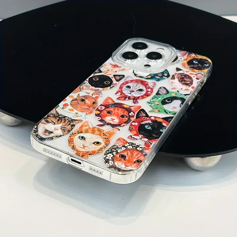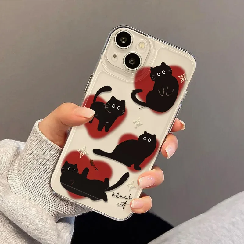 Discover a tale of two feline charms - mystical black cats lounging on crimson hearts next to spirited kitties wrapped in delicate headscarves. From sleek shadows casting dreamy silhouettes to bright-eyed cats in their patterned kerchiefs. these clear cases protect while they enchant.