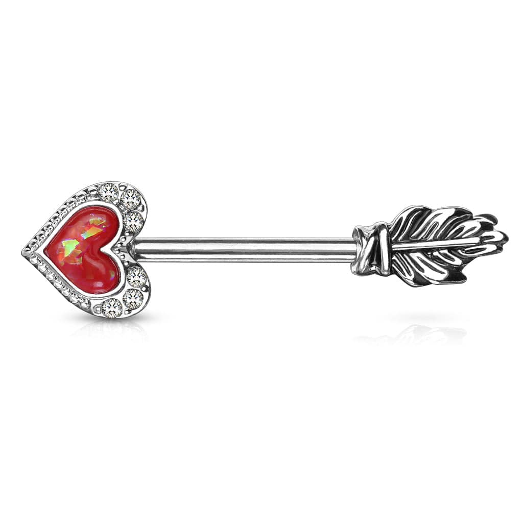 Red Opal Heart & Feather Arrow Surgical Steel Nipple Ring Barbell