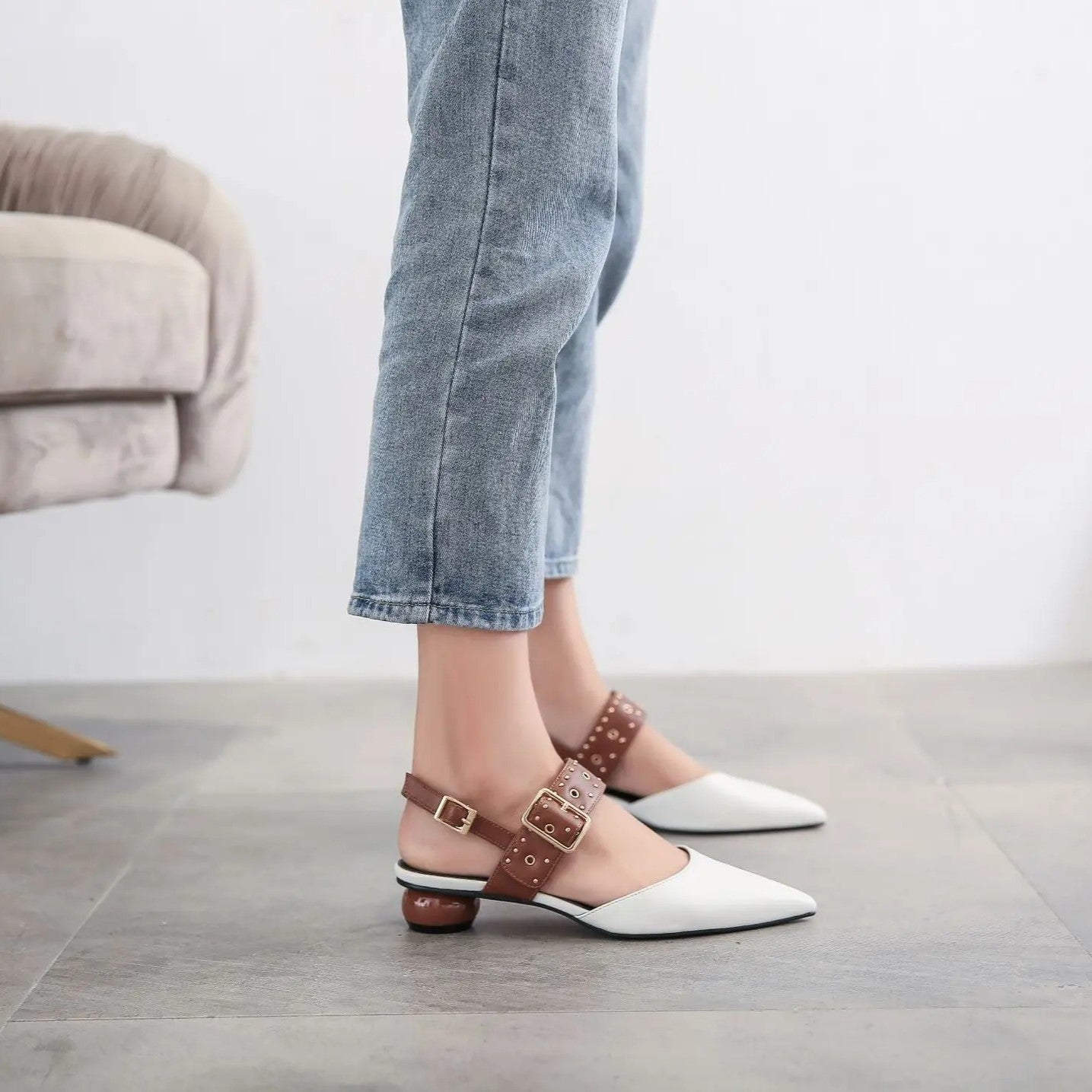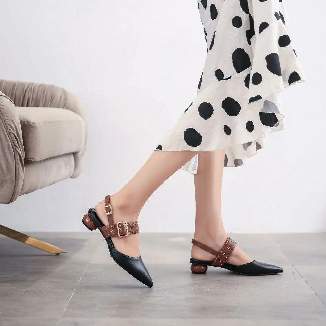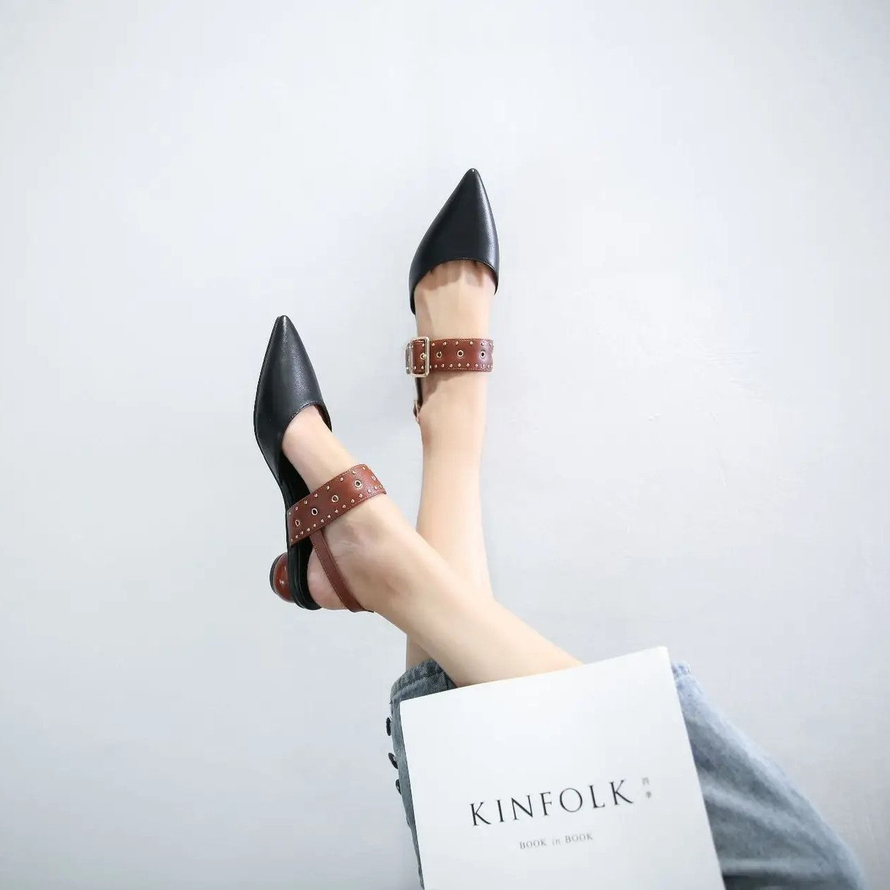 Pointed toe with secure adjustable straps. these women's sandals feature a comfortable low heel and are a statement piece accented with bold rivets for day-to-night wear.