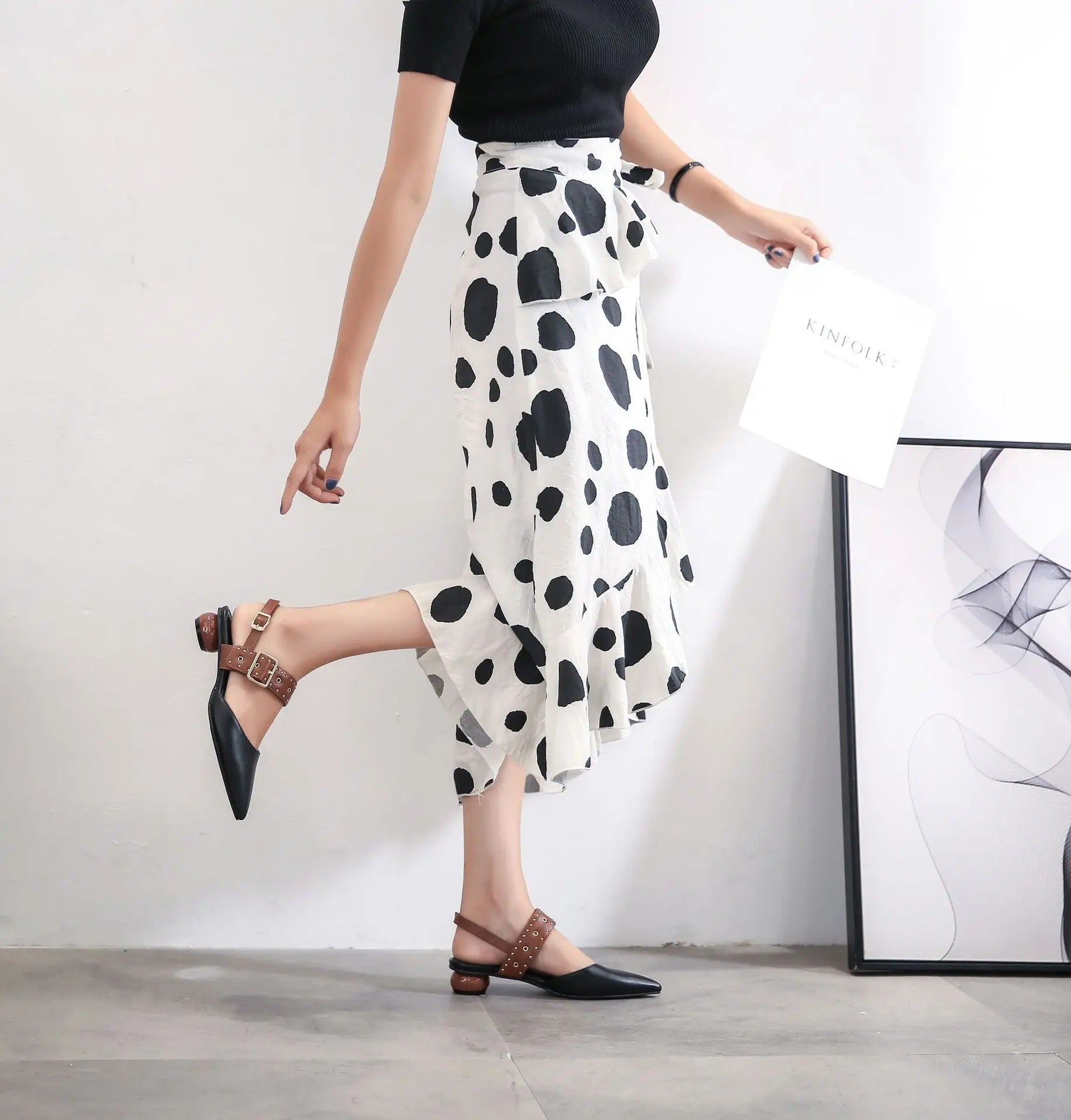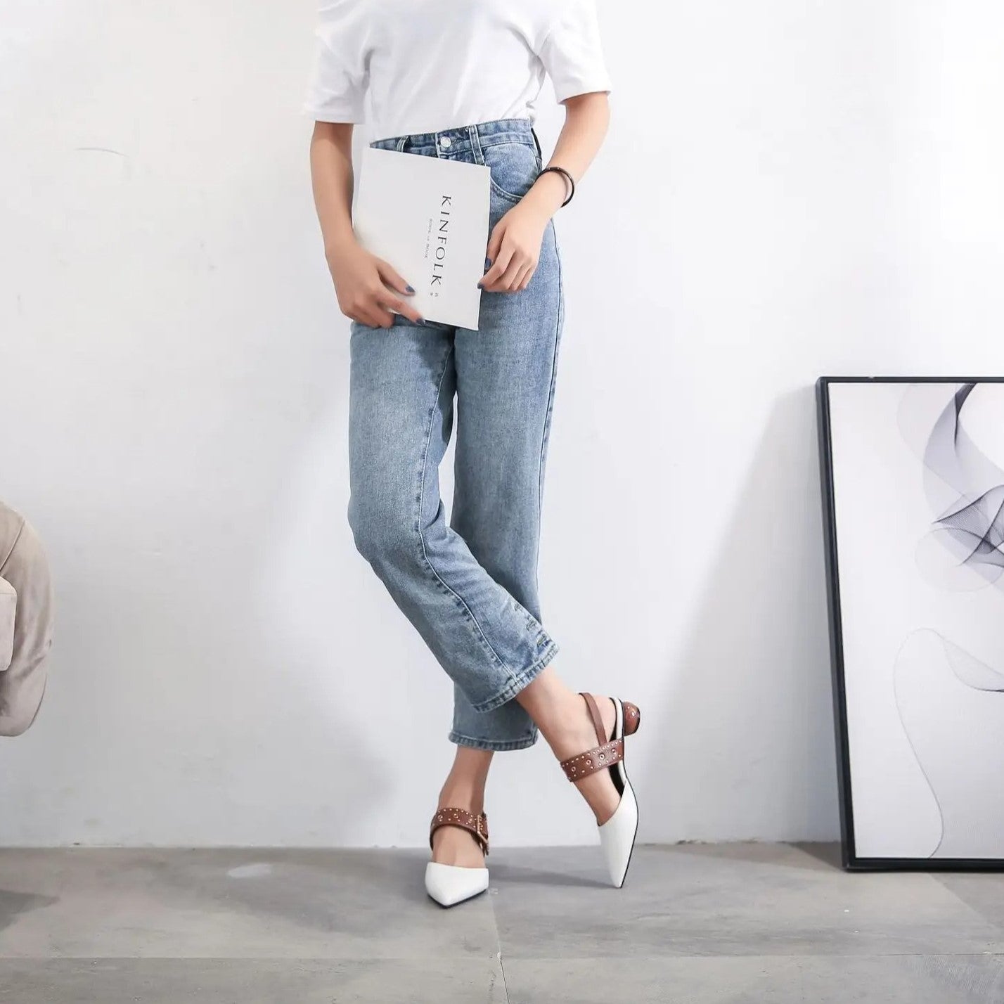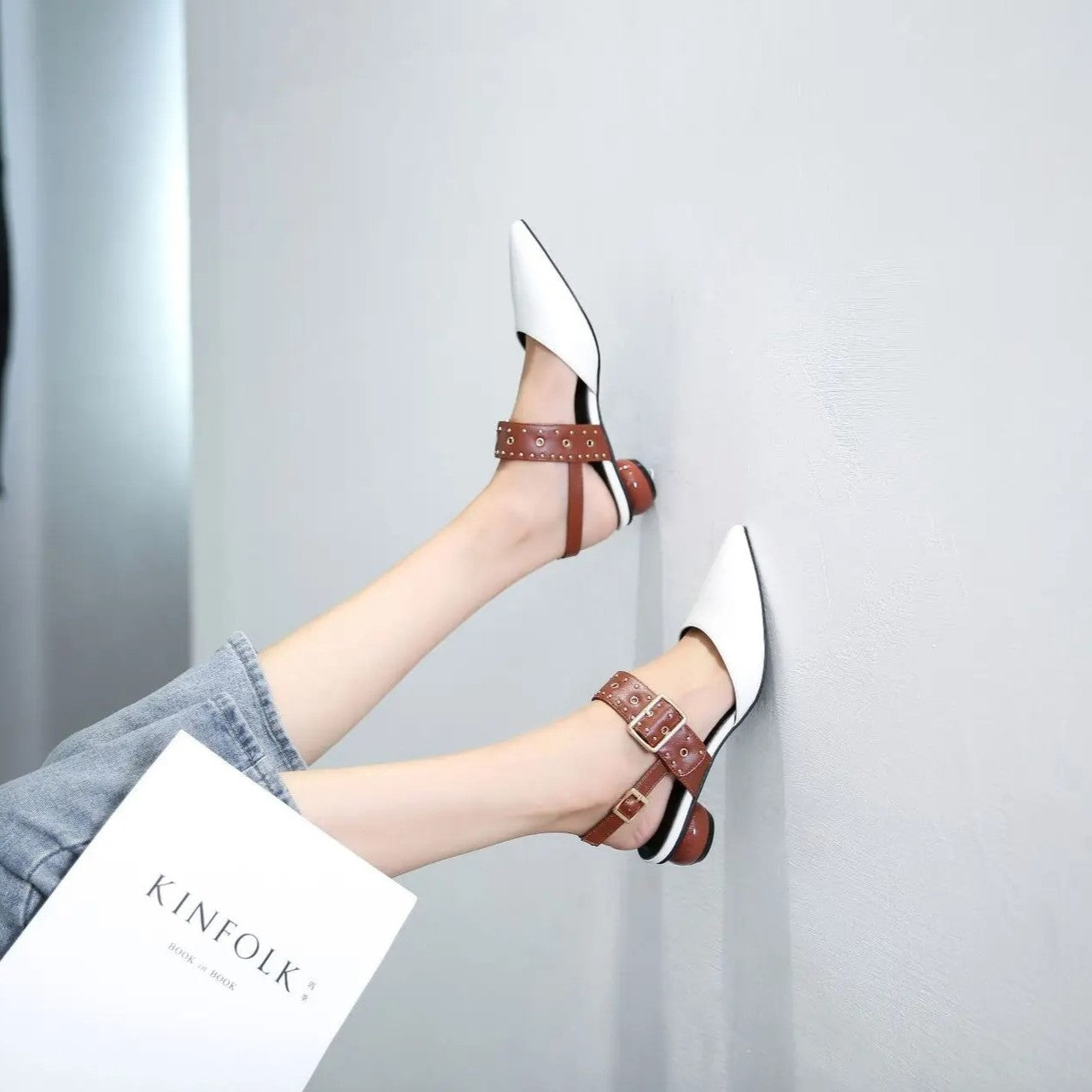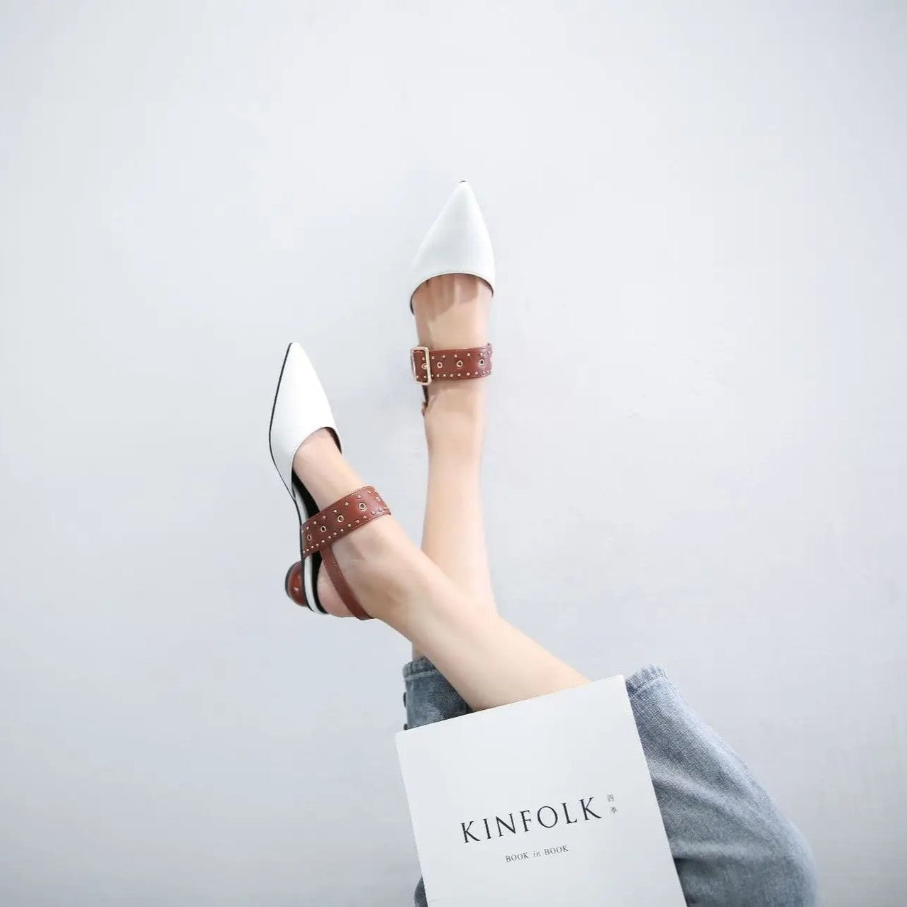 Pointed toe with secure adjustable straps. these women's sandals feature a comfortable low heel and are a statement piece accented with bold rivets for day-to-night wear.