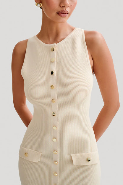 Effortless sophistication meets versatility in this sleeveless button-front maxi dress. The lightweight knit fabric drapes beautifully in a relaxed column silhouette. A chic round neckline frames the face.