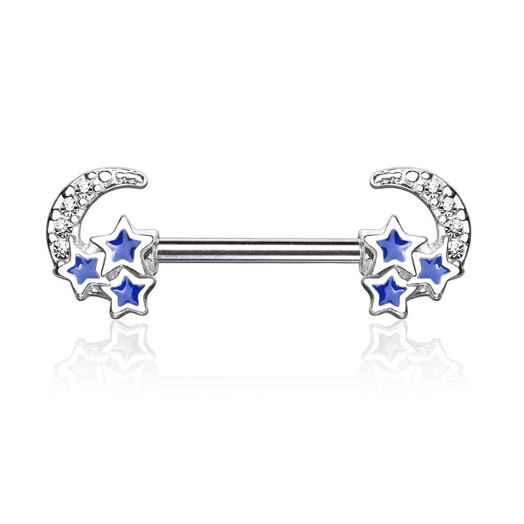 Surgical Steel Crescent Moon & Blue Stars Nipple Ring Barbell