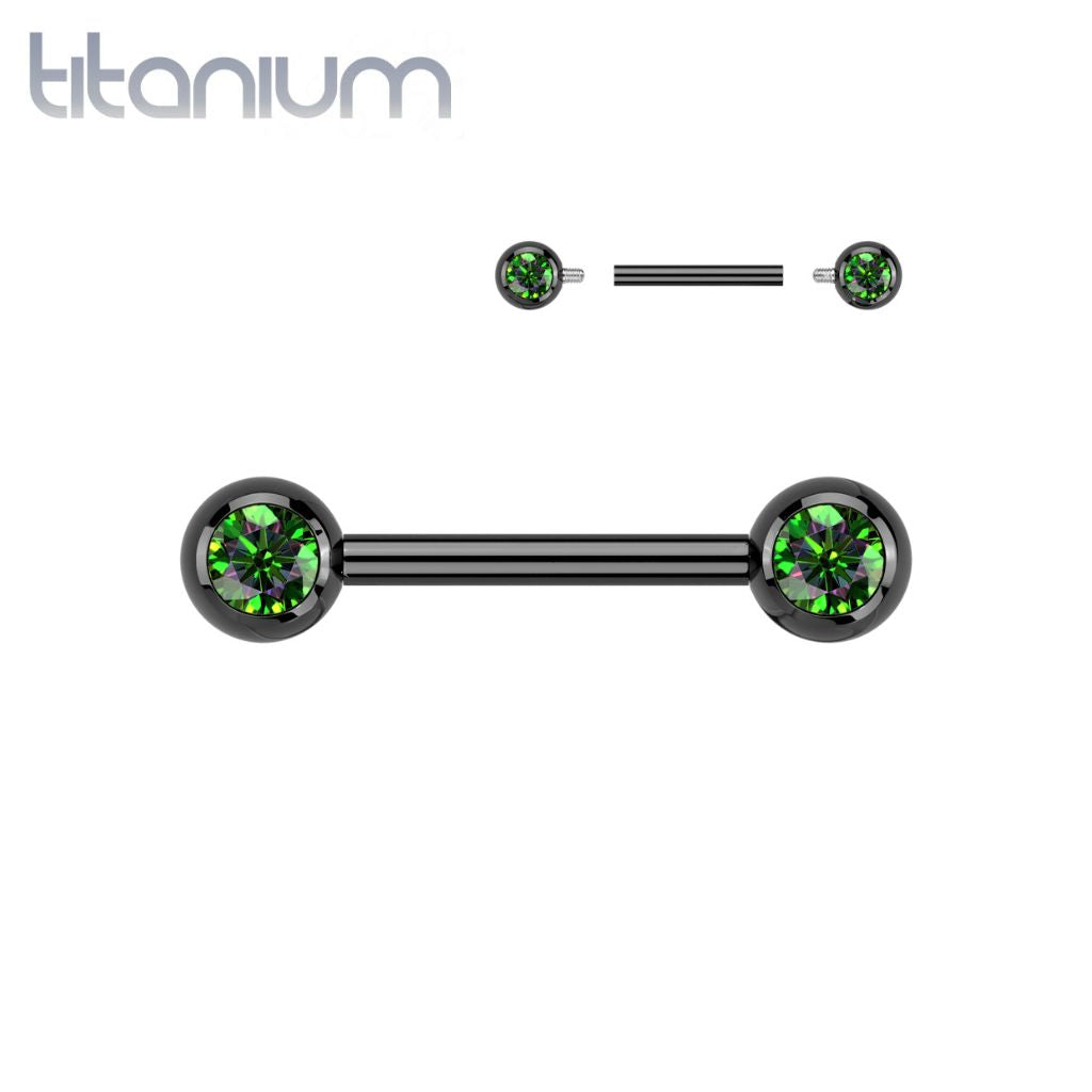 You'll love this classic yet elegant nipple ring. Made from the finest implant grade titanium with black plating and high quality front-facing vitrail medium CZ gems. this nipple ring will be a great addition to your collection. Available in two lengths: 1/2"(12mm) with 5mm balls and 5/8"(16mm) with 6mm balls. This barbell is internally threaded and is secured on one side.