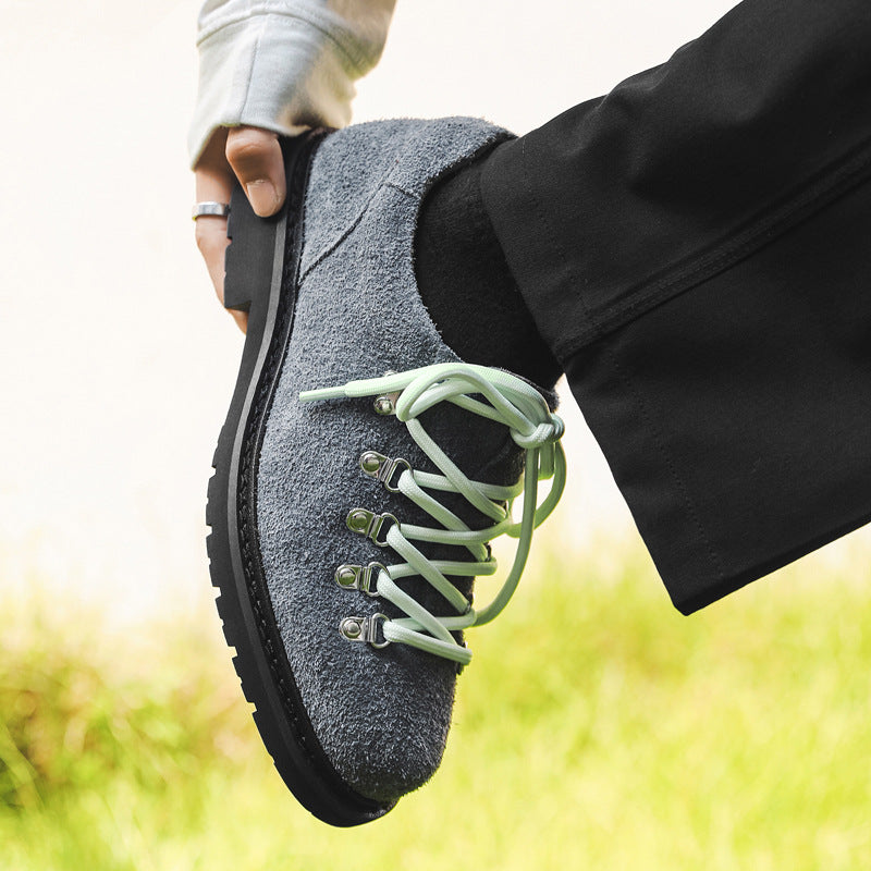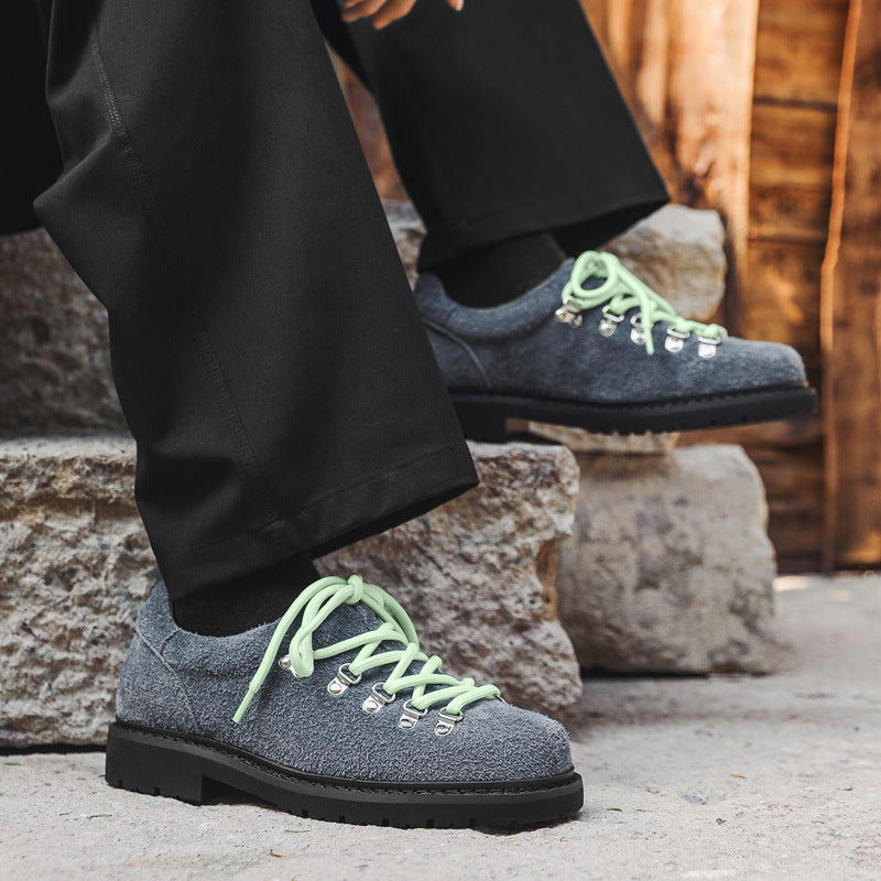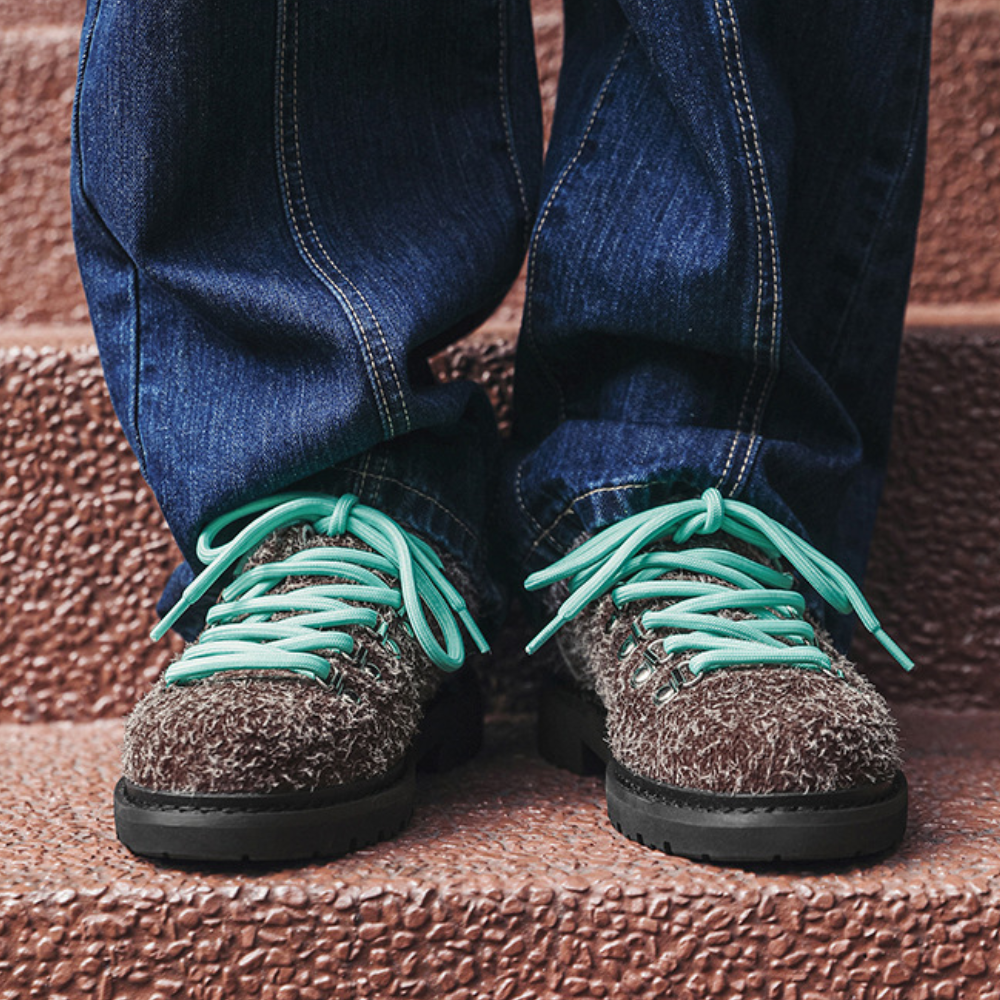 The richly textured suede upper is paired with striking rope-style laces and a rugged sole. creating a statement piece that balances elegance and functionality.