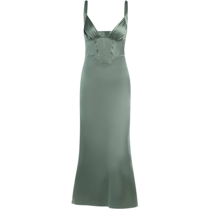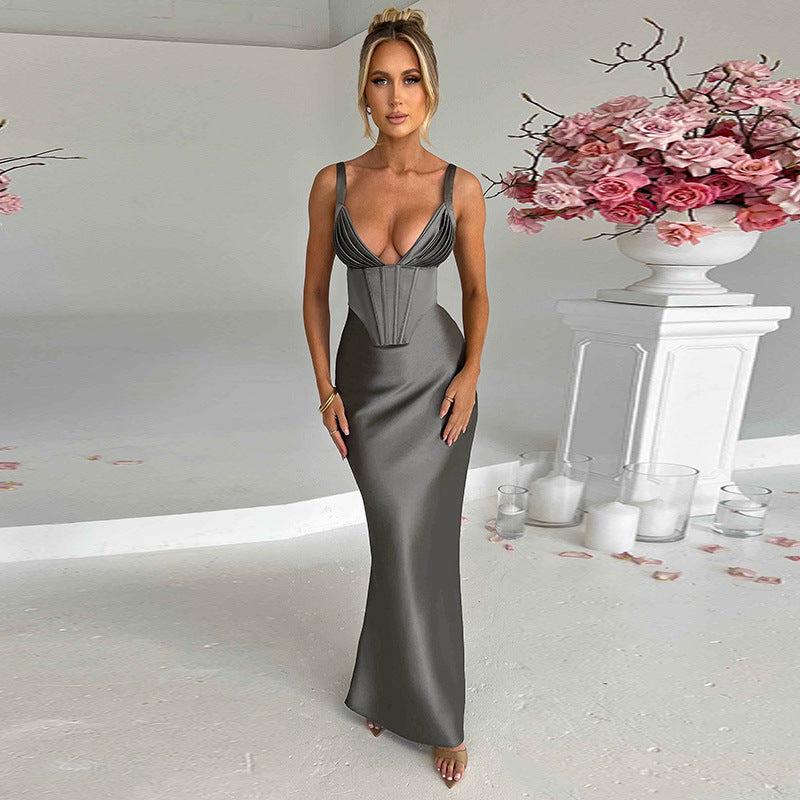 The luxurious satin fabric drapes beautifully over your curves. creating a smooth and flattering silhouette. The deep V neckline adds a touch of allure and femininity. while the slim straps provide a delicate and refined look.