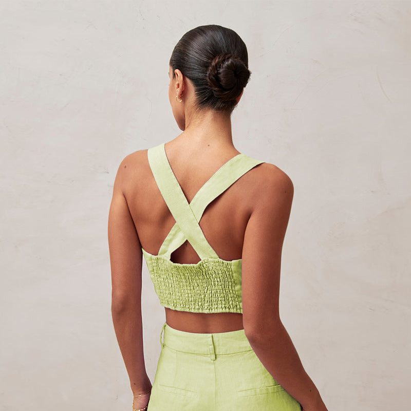 The Azura vest features a flattering square neckline that frames your décolletage beautifully. Its ultra-short length sits just right. making it ideal for pairing with high-waisted bottoms. The standout feature is the stylish criss-cross back. which adds a touch of intrigue and ensures a secure fit.