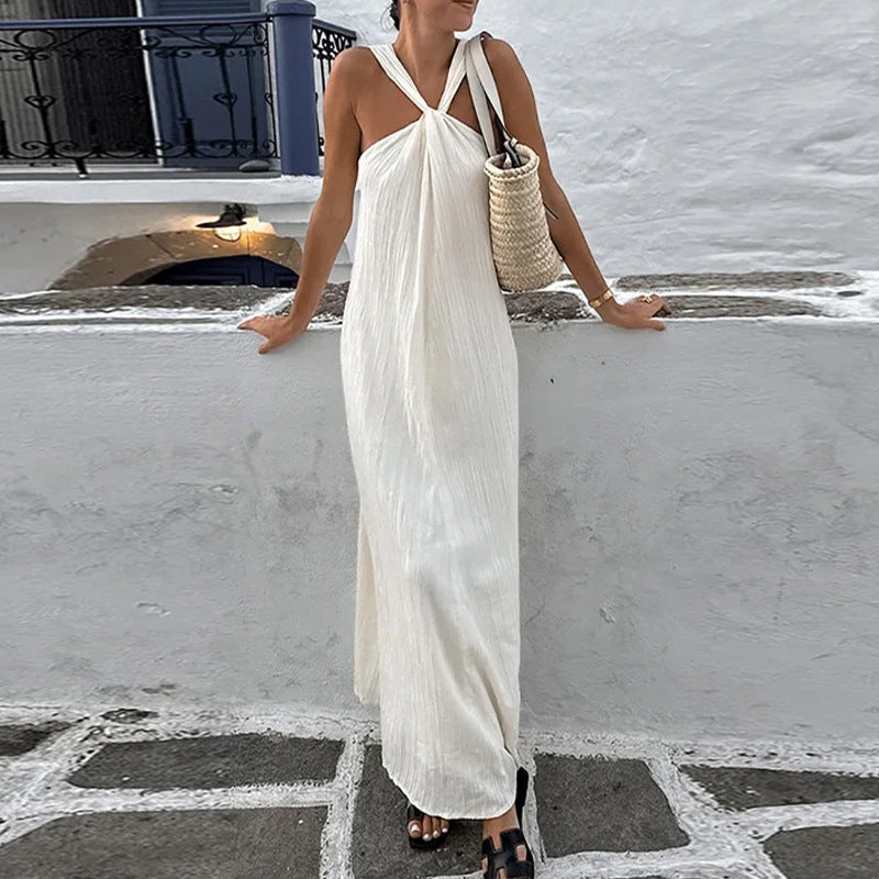 Embrace effortless. beach-ready style in the Layla Halterneck Cotton Beach Dress. Crafted from a comfortable cotton-spandex blend. this sleeveless maxi features a flattering halter neckline and a wide waistband for a figure-flattering fit.
