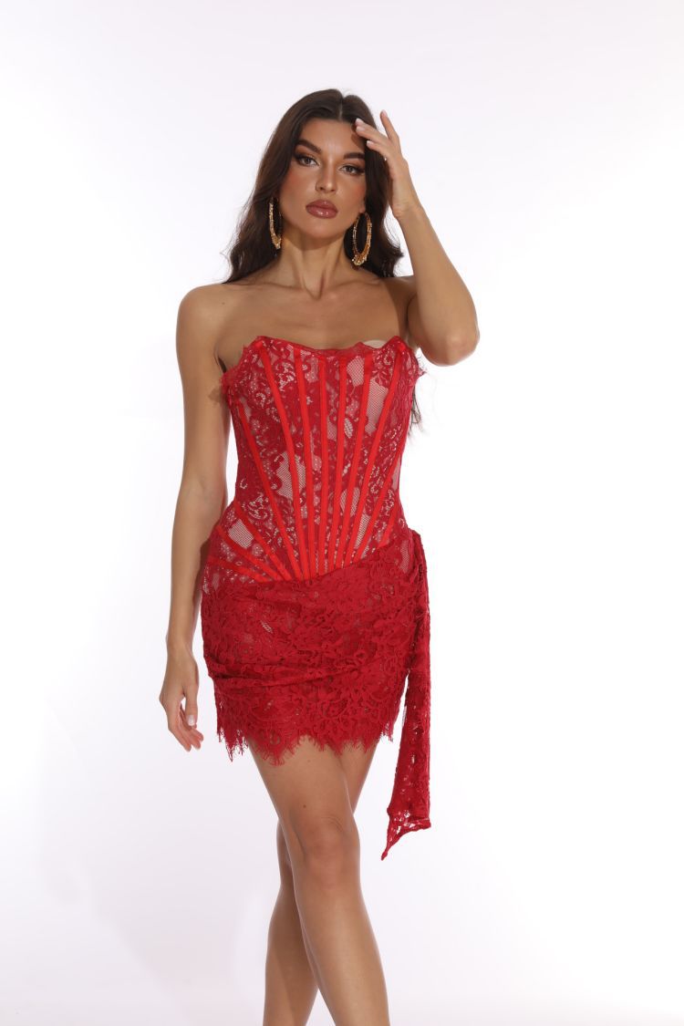 Unleash your inner seductress in the sultry Lana strapless lace mini dress! Lavished with romantic floral lace appliqués. this scene-stealing little black dress turns heads with its alluring sheer mesh panels.