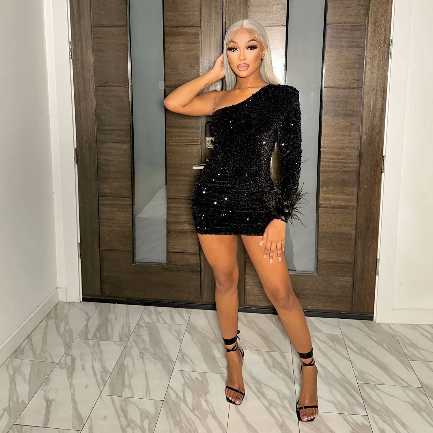 This show-stopping Natalie dress is perfect for any cocktail party or special event. The one-shoulder silhouette and feather-trimmed long sleeves add a touch of glamour. while the bodycon fit and sequin embellishments create a figure-flattering. head-turning look.